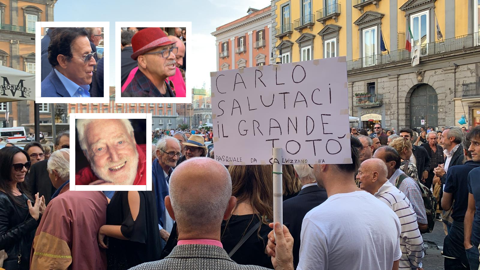 Carlo Croccolo ha lavorato con i più grandi esponenti della nobile arte. Da Eduardo De Filippo al Principe Antonio de Curtis, in arte Totò. E proprio a quest’ultimo era dedicato un cartello di uno dei tanti partecipanti alla funzione: “Ciao Carlo, salutaci Totò“.