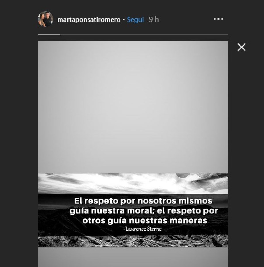 Così, oggi, Marta Ponsati Romero ha pubblicato una storia sui social con questo testo molto enigmatico: “Il rispetto per gli altri guida le nostre maniere“, tratto da una frase di Laurence Stern.