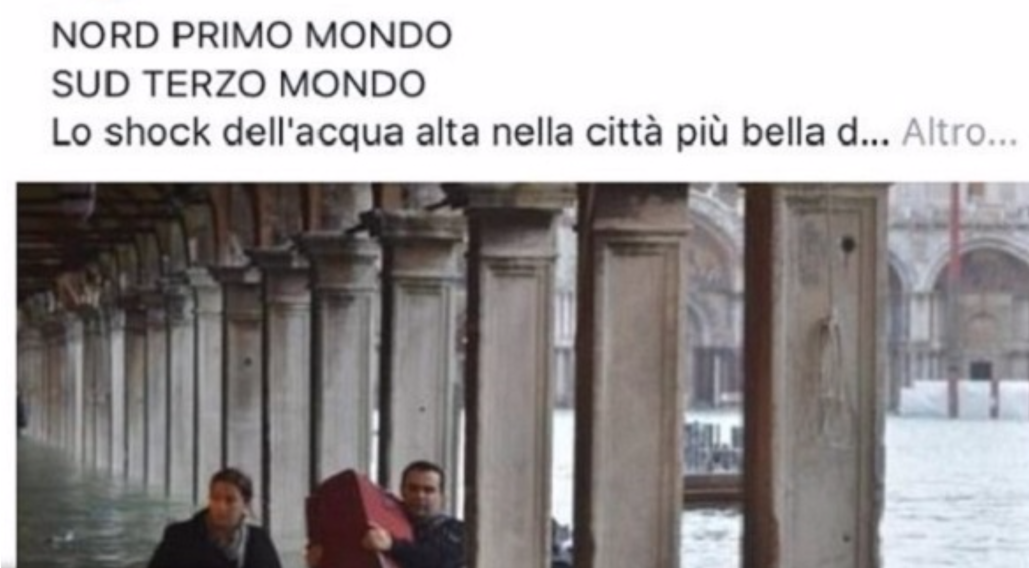 “Nord primo mondo, Sud terzo mondo“, è il titolo del suo squallido post su Facebook. “Lo shock dell’acqua alta nella città più bella del mondo farà riaprire gli occhi a lombardi e veneti?