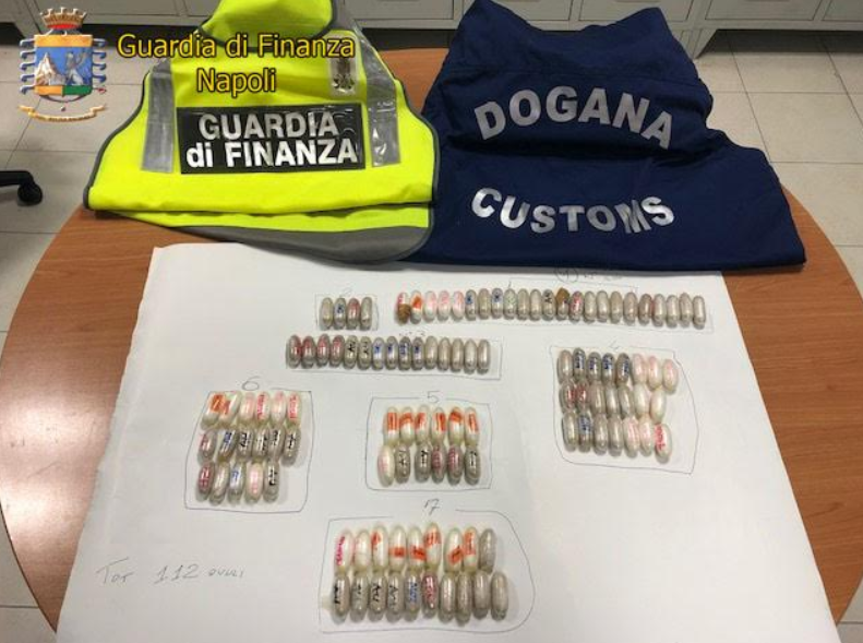 Nell’ambito di una costante attività di controllo, volta a prevenire traffici illeciti, gli uomini della Guardia di Finanza di Capodichino hanno fermato il 24enne mentre stava per lasciare l’aeroporto. Quando il ragazzo, che era atterrato da Parigi, ha iniziato a innervosirsi, i finanzieri si sono insospettiti e l’hanno portato in ospedale, dove è stato sottoposto a un esame radiografico. I risultati hanno mostrato la presenza di 112 ovuli all’interno dell’addome per un totale di 1,244 kg di droga.