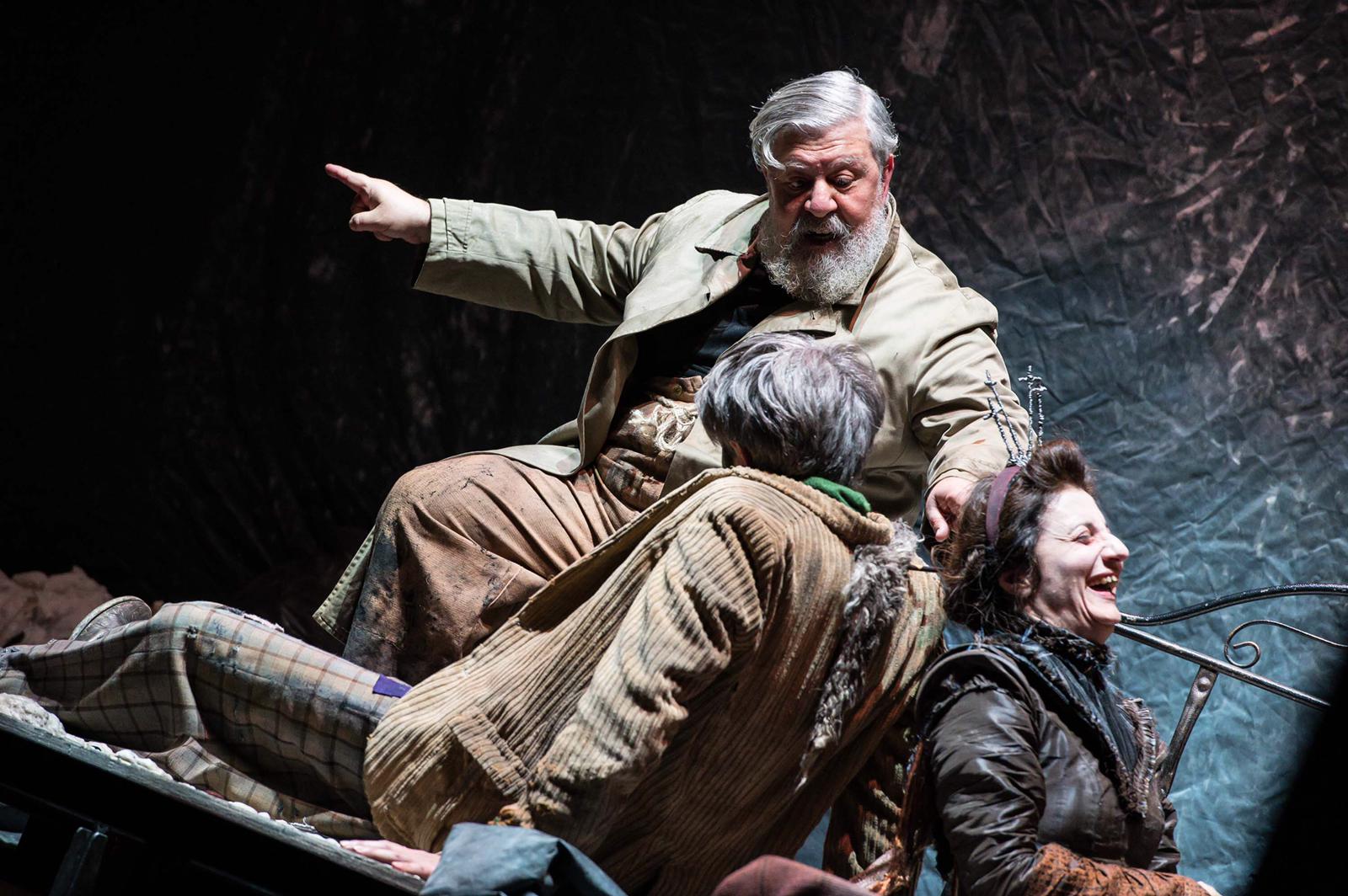 L’uscita trionfale da una botola al centro del palco dei miserabili travestiti da nobili con costumi dal gusto kitsch (tipico dei cosiddetti cafoni arricchiti privi di buongusto) è un altro espediente, forse didascalico, ma efficace nel mostrare l’ascesa dagli “inferi” oscuri e squallidi al paradiso dalle pareti bianche della ricca dimora nobiliare. Lo spettacolo non è privo, visto il respiro innovativo, di alcune modifiche del testo originale come nel caso dell’uso di anglicismi appositamente storpiati.