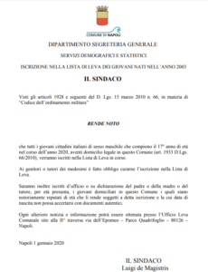 “Iscrizione nelle liste di leva dei giovani nati nell’anno 2003”, la  comunicazione pubblicata sul sito del Comune di Napoli e rivolta ai cittadini che compiono 17 anni nel corso del 2020, sta creando preoccupazione tra le mamme napoletane attraverso i social e su WhatsApp. Ma ciò non ha nulla a che vedere con il ripristino della leva obbligatoria o ancora peggio con i venti di guerra che soffiano dall’Iran.