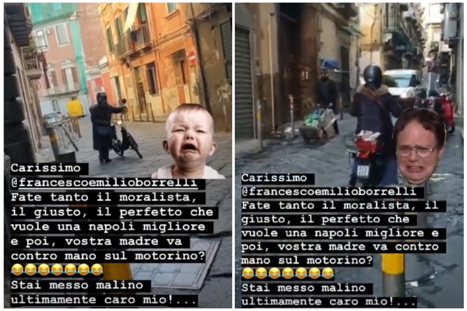 Nel commento alla storia il neomelodico scrive: “Carissimo Borrelli fate tanto il moralista, il giusto, il perfetto che vuole Napoli migliore e poi vostra madre va contro mano sul motorino? Stai messo malino ultimamente caro mio”.