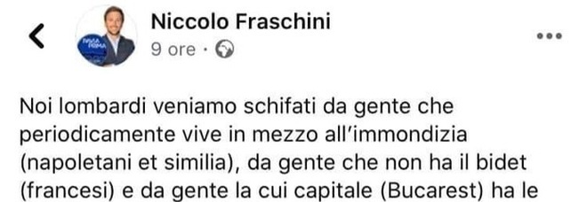 “Noi lombardi veniamo schifati da gente che periodicamente vive in mezzo all’immondizia (napoletani et similia), da gente che non ha il bidet (francesi) e da gente la cui capitale (Bucarest) ha le fogne popolate da bambini abbandonati. Da queste persone non accettiamo lezione di igiene: tranquilli, alla fine di tutto questo, i ruoli torneranno a invertirsi”. È il post della vergogna lanciato sui social poche ore fa da Niccolò Fraschini, consigliere comunale di Pavia, eletto in una lista di centrodestra in appoggio al sindaco Fabrizio Fracassi.