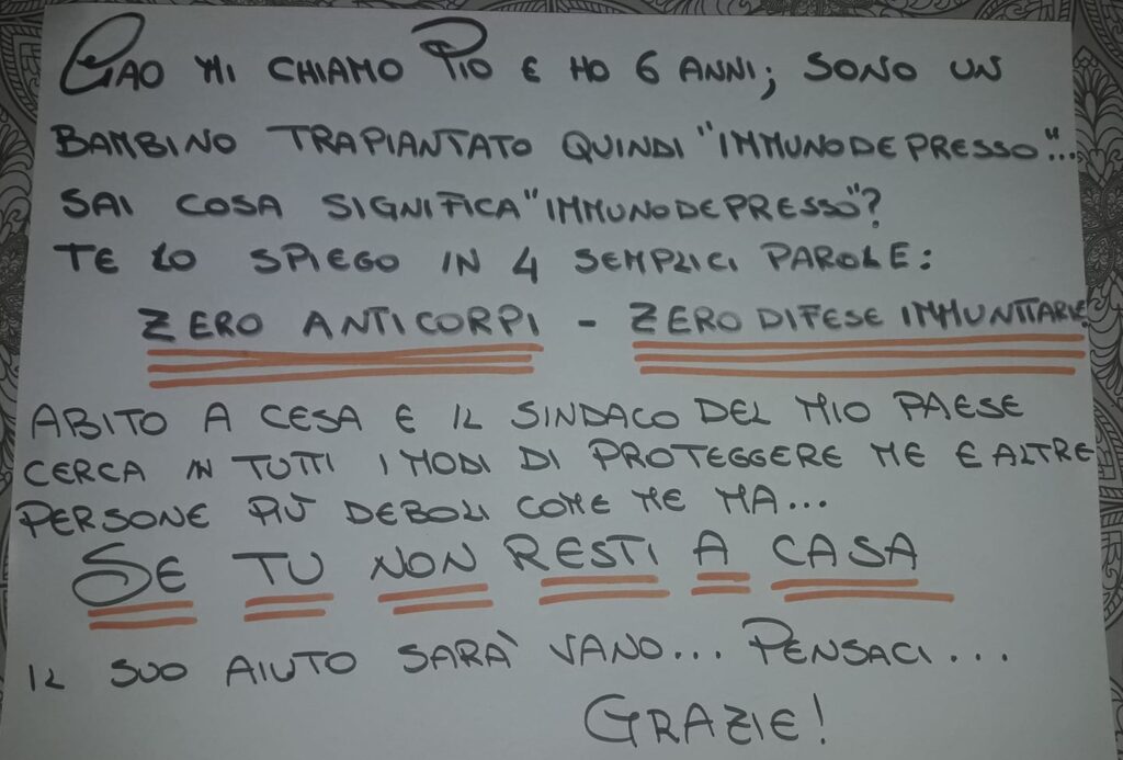 Ciao, ho sei anni, sono un bambino trapiantato quindi immunodepresso. Sai cosa significa immunodepresso? Zero anticorpi, zero difese immunitarie. Abito a Cesa e il sindaco del mio paese cerca in tutti i modi di proteggere me e altre persone più deboli come me ma…se tu non resti a casa, il suo aiuto sarà vano…pensaci“.