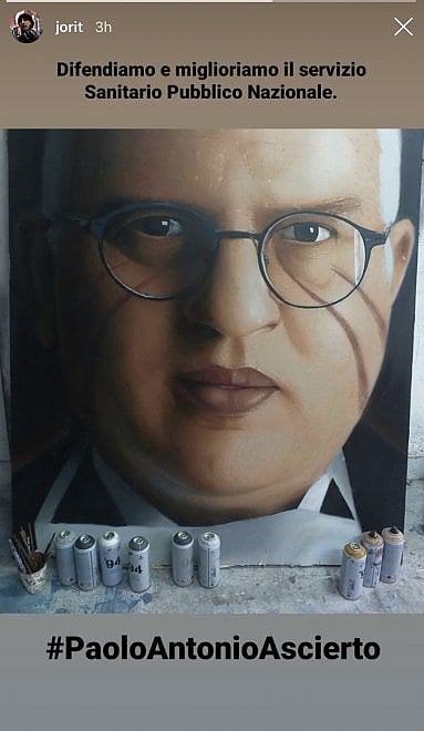 Jorit nelle sue Instagram Stories ha pubblicato la foto del murale realizzato per il medico napoletano, a capo dell’equipe che – con il Cotugno di Napoli e altri colleghi cinesi e italiano – ha messo a punto la richiesta di sperimentazione ufficiale del Tolicizumab per il trattamento del Covid-19.