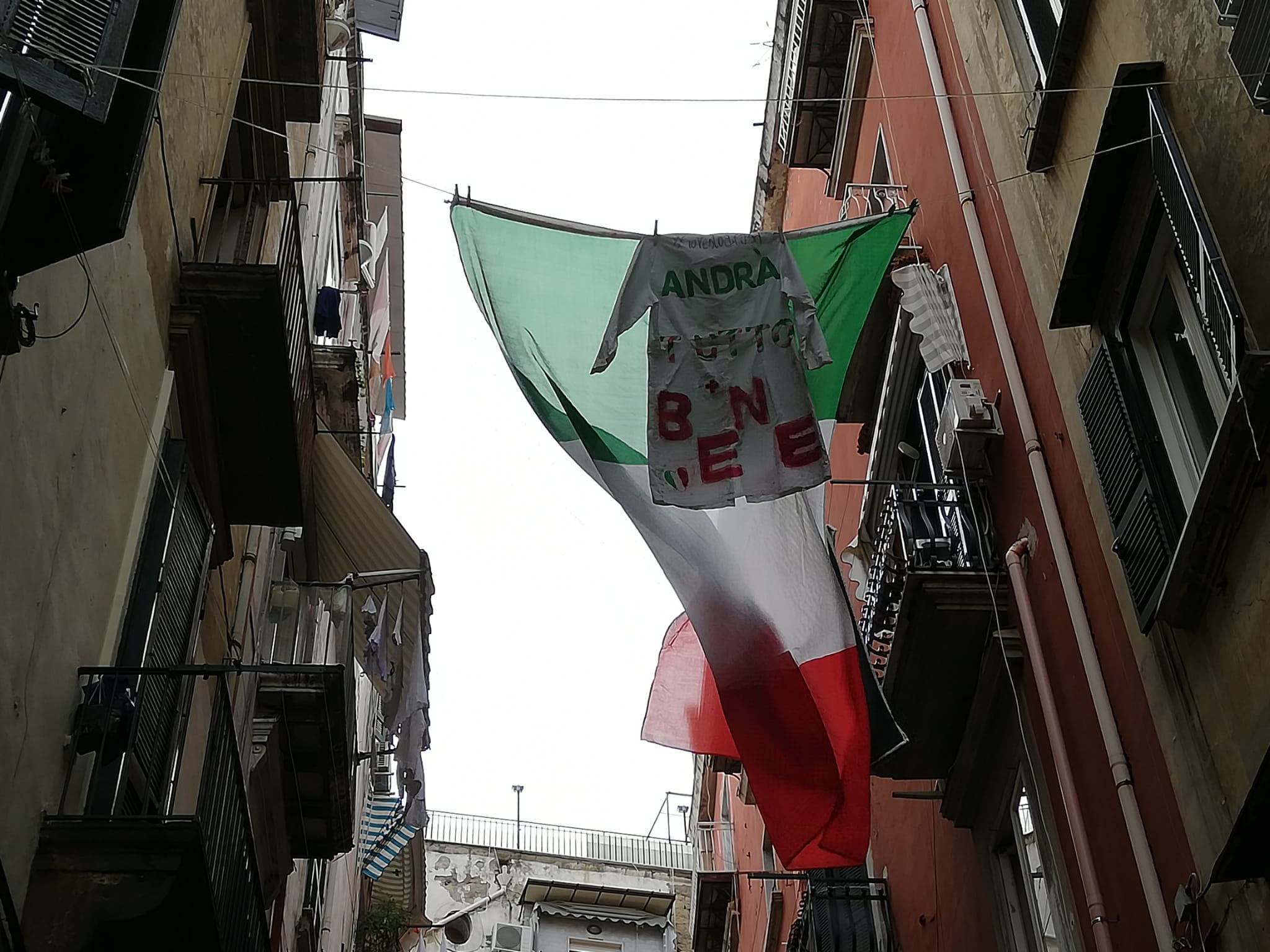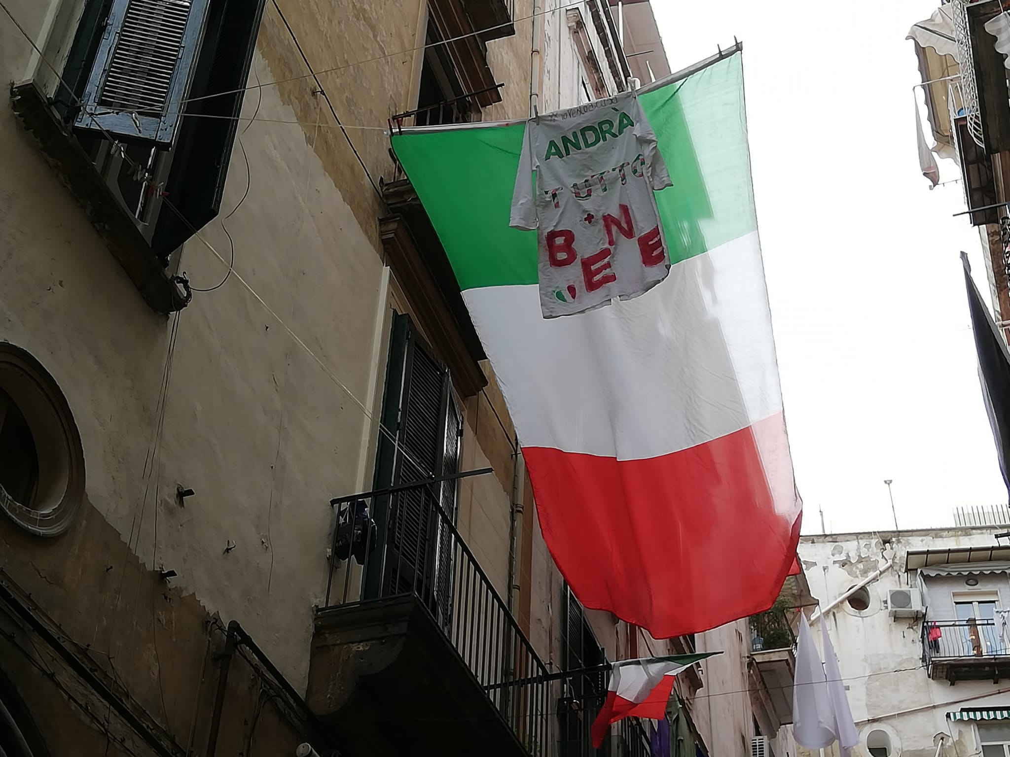 Abbiamo iniziato il nostro tour scendendo da Sant’Anna di Palazzo. L’abbiamo concluso salendo via San Mattia. Quasi alla fine della strada c’è un filo, teso e steso tra due edifici, uno di fronte all’altro. Sopra, al centro, è appesa una maglietta bianca con i colori della bandiera italiana e una scritta: “Andrà tutto bene“.