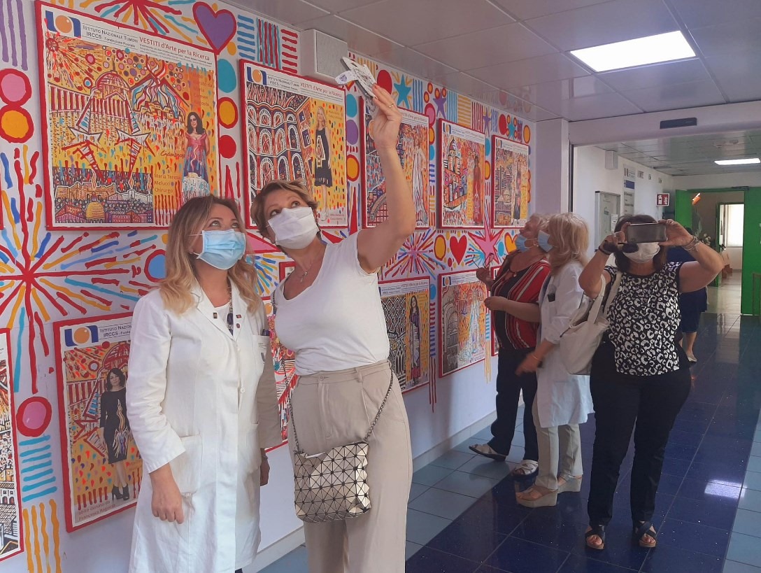 Sulla parete grande della sala d’attesa 14 pannelli con la foto della Pinto e di altre dottoresse e infermiere del Pascale, campeggiano tra stelle e fuochi d’artificio, a ricordare che l’ospedale non è solo un luogo di colore. Un ospedale è soprattutto fatto di persone. La parete delle stelle richiama gente, ma nella sala d’attesa ci sono altri dipinti, un murales e due quadri donati dall’architetto Alessandro Ciambrone e un Vesuvio che spacca il virus dell’ “artista del Vesuvio”, Gennaro Regina che ha promesso di donare all’Istituto un’altra sua opera. Grazie alla solidarietà di questi due artisti un mese fa è partito il bando “Adotta una parete” del Pascale, l’invito a artisti professionisti e non a donare un loro dipinto per colorare le pareti del più grande polo oncologico del Mezzogiorno.