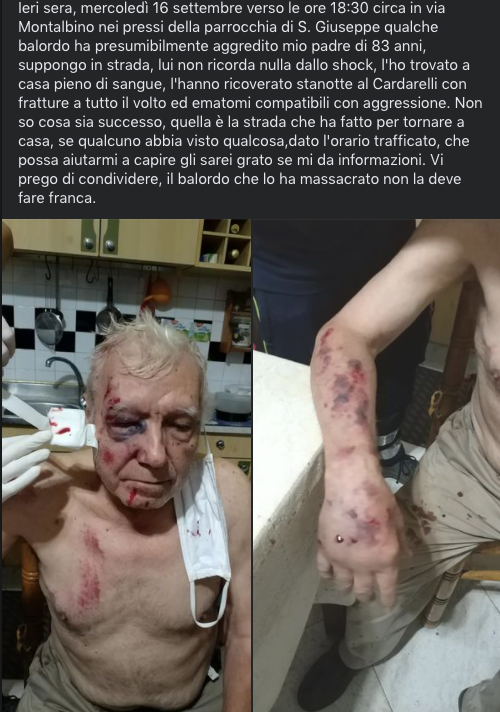 “Ieri sera, mercoledì 16 settembre verso le ore 18:30 circa in via Montalbino nei pressi della parrocchia di S. Giuseppe qualche balordo ha presumibilmente aggredito mio padre di 83 anni, suppongo in strada, lui non ricorda nulla dallo shock, l’ho trovato a casa pieno di sangue, l’hanno ricoverato stanotte al Cardarelli con fratture a tutto il volto ed ematomi compatibili con aggressione. Non so cosa sia successo, quella è la strada che ha fatto per tornare a casa, se qualcuno abbia visto qualcosa, dato l’orario trafficato, che possa aiutarmi a capire gli sarei grato se mi da informazioni. Vi prego di condividere, il balordo che lo ha massacrato non la deve fare franca”.