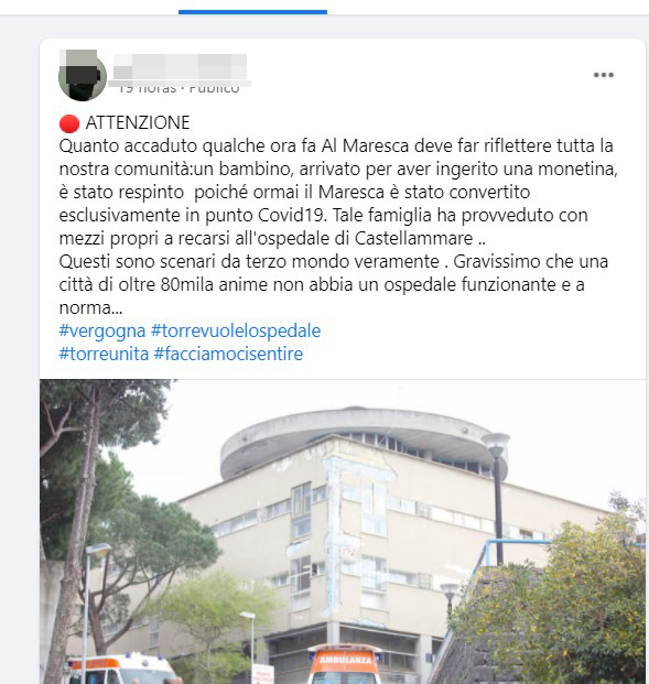 Secondo la testimonianza, pare che un bambino è stato accompagnato dai genitori al pronto soccorso dell’ospedale Maresca dopo aver ingerito una monetina. Una volta arrivati, però, i medici avrebbero spiegato che il presidio non poteva accogliere il piccolo paziente perché dedicato ai pazienti Covid e avrebbe quindi chiesto loro di rivolgersi a un’altra struttura.