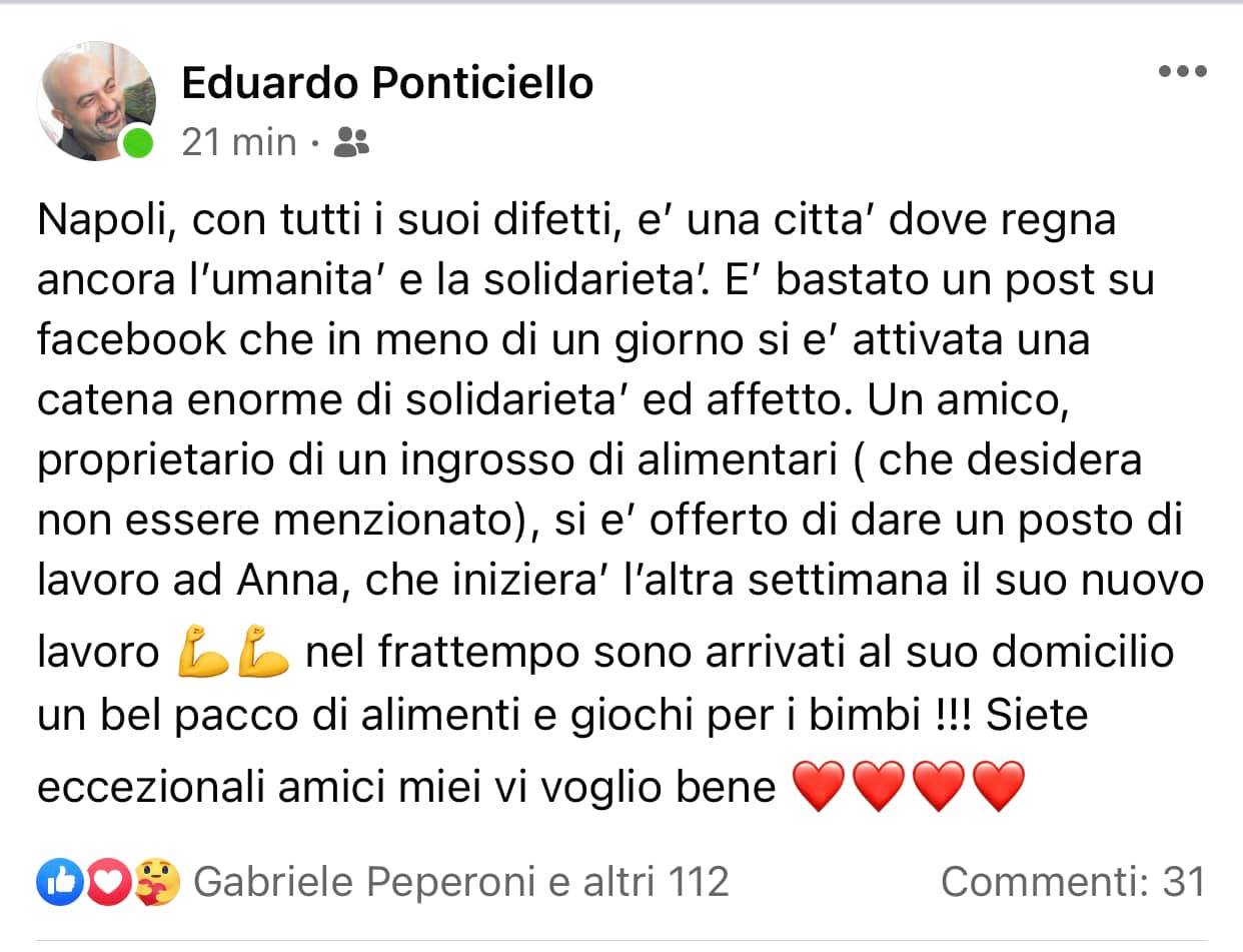 “Napoli, con tutti i suoi difetti, è una città in cui regna ancora l’umanità e la solidarietà. E’ bastato un post su fb e in meno di un giorno si è attivata una catena enorme di solidarietà e di affetto. Un amico, proprietario di un ingrosso di alimentari (che desidera non essere menzionato), si è offerto di dare un posto di lavoro ad Anna, che inizierà la prossima settimana. Nel frattempo sono arrivati al suo domicilio un bel pacco di alimenti e giochi per bimbi. Siete eccezionali amici miei, vi voglio bene”.