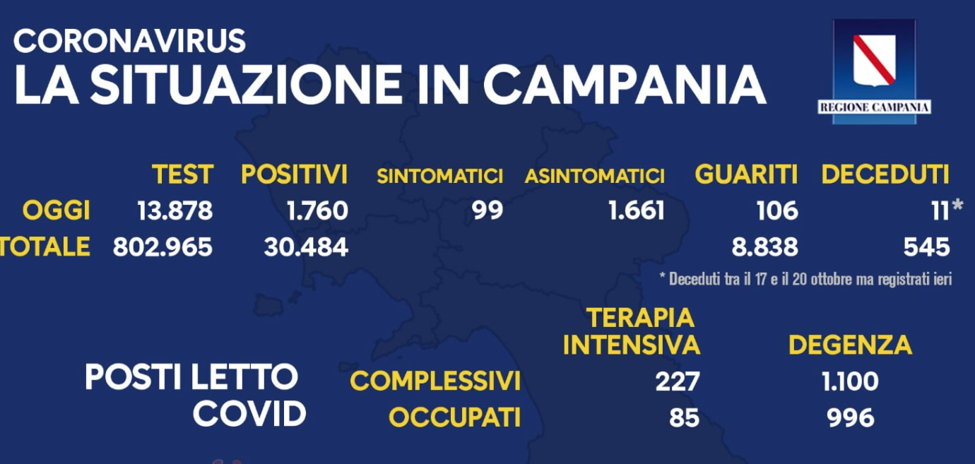 Forte balzo in avanti dei contagi in Campania. Nelle ultime 24 ore sono stati 1.760 rispetto ai 1.312 di ieri. I tamponi effettuati sono stati 13.878 contro i precedenti 10.205. I morti sono 11, deceduti tra il 17 ed il 20 ottobre ma registrati nella giornata di ieri.