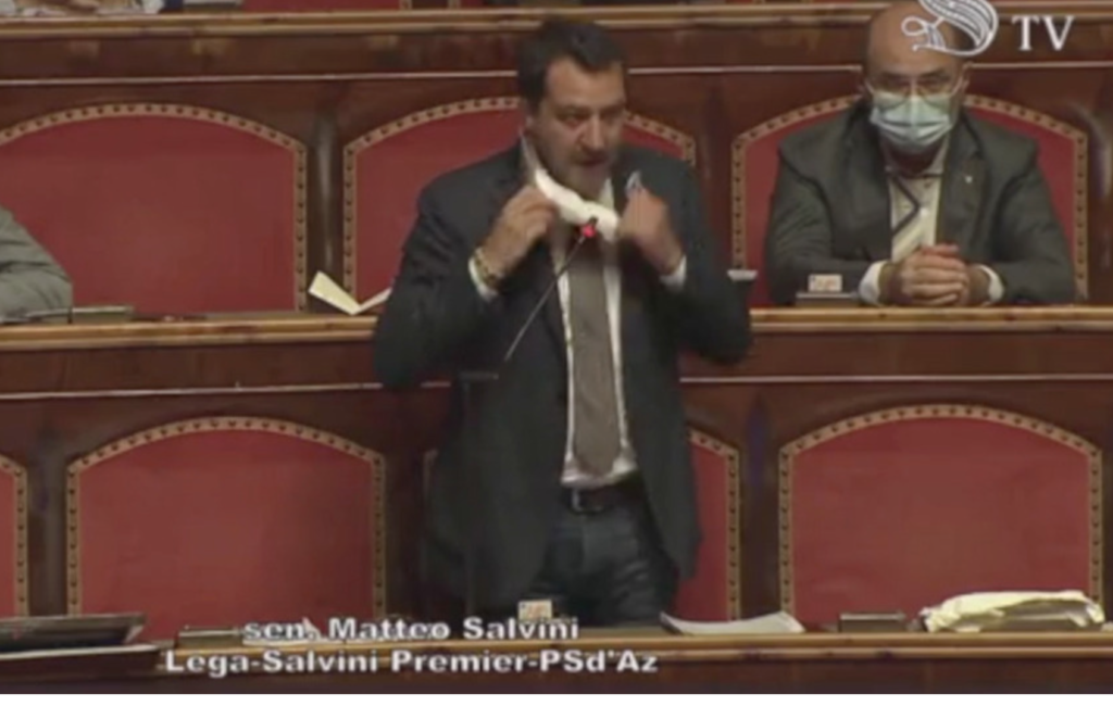 “Nel frattempo il presidente Conte non è al Senato né alla Camera ma sta parlando in una conferenza stampa in tv. Allora andate avanti voi. Noi usciamo da questa aula perché il Senato ha ancora una dignità”. Mentre pronunciava queste parole Matteo Salvini si è tolto la mascherina da naso e bocca e ha parlato per qualche secondo senza.