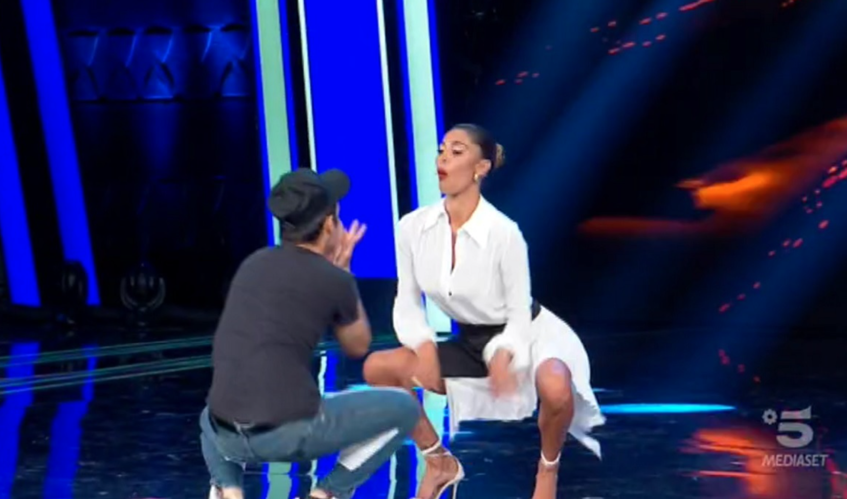 La sudamericana ha accettato la proposta e si è scatenata sul palco, con tanto di twerking intrigante con tacco dodici. A Fusco ha quasi preso un colpo, tanto che ha rischiato di cascare per terra perdendo il passo. L’ex di Stefano De Martino l’ha poi piantato in asso, tornando a sedersi dietro al bancone dei conduttori. Alle sue spalle, Emanuel ha portato l’indice alla bocca, gesto classico dello zittire.
