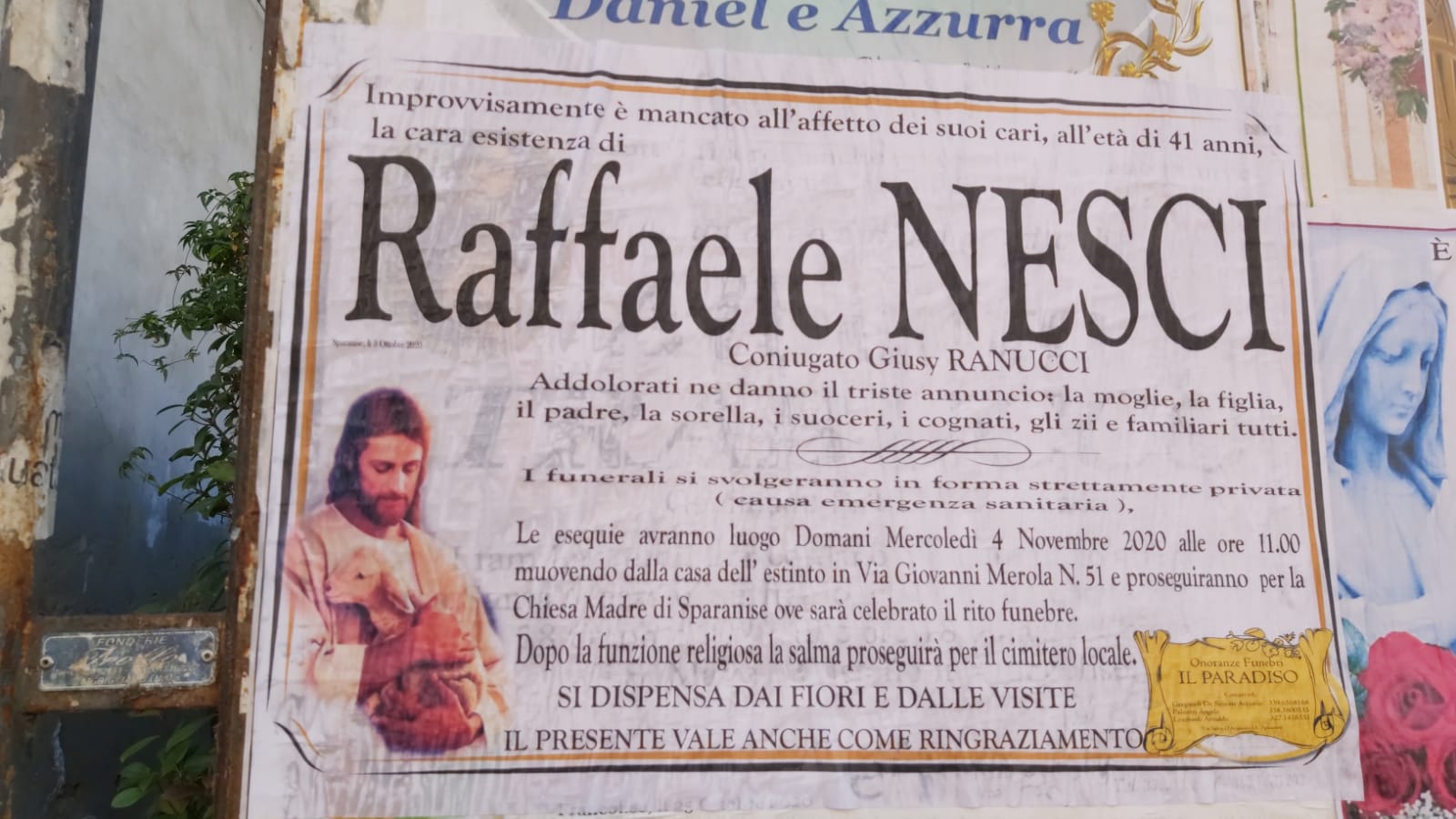 I funerali saranno celebrati in forma privata causa emergenza Covid domani mattina: il rito funebre sarà officiato alle 11 nella chiesa madre di Sparanise. Raffaele lascia la moglie e una bambina e un vuoto incolmabile in quanti lo hanno conosciuto.