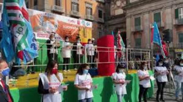 La manifestazione si svolge nel rispetto delle norme anti-Covid. Nell’area davanti al palco, delimitata da transenne, ci sono circa quattrocentocinquanta sedie distanziate tra loro. Le prime file sono occupate dagli operai della Whirlpool. Presenti i gonfaloni dei Comuni di Napoli e Afragola.