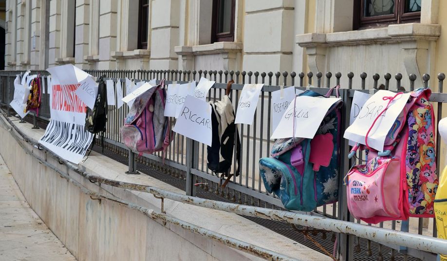 L’idea iniziale era di appendere gli zaini e andare via, ma l’ampia partecipazione ha trasformato la protesta delle cartelle in un momento di attività all’aperto per i bambini, un modo per farli incontrare per ricostruire, almeno in parte, una dimensione di normalità.