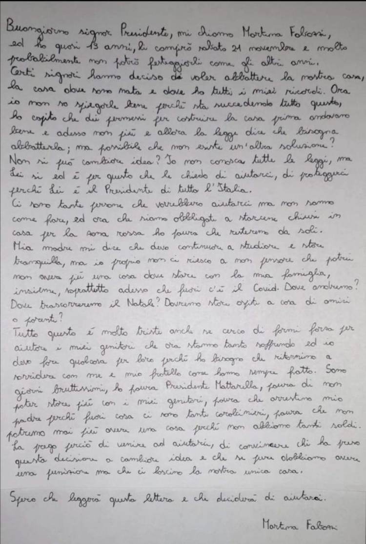 Per Martina la notizia ha scaturito tanta tristezza e sconforto. La piccola, munita di carta e penna ha confessato al Presidente di avere tanta paura. Si legge dal sopracitato giornale: “Mia madre mi dice che devo continuare a studiare e stare tranquilla, ma io proprio non ci riesco a non pensare che potrei non avere più una casa dove stare con la mia famiglia, insieme, soprattutto adesso che fuori c’è il Covid. Dove andremo? Dove trascorreremo il Natale? Dovremo stare ospiti a casa di amici o parenti? Tutto questo è molto triste anche se cerco di farmi forza per aiutare i miei genitori che ora stanno tanto soffrendo ed io devo fare qualcosa per loro perché ho bisogno che ritornino a sorridere con me e mio fratello come hanno sempre fatto. Sono giorni bruttissimi, ho paura Presidente Mattarella, paura di non poter stare più con i miei genitori, paura che arrestino mio padre perché fuori casa ci sono tanti carabinieri, paura che non potremo mai più avere una casa perché non abbiamo tanti soldi. La prego perciò di venire ad aiutarci, di convincere chi ha preso questa decisione a cambiare idea e che se pure dobbiamo avere una punizione ma che ci lascino la nostra unica casa. Spero che leggerà questa lettera e che deciderà di aiutarci”.