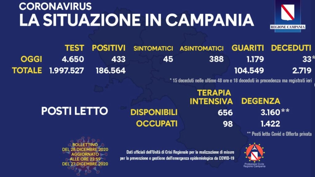 In Campania, nelle ultime 24 ore, si sono registrati 433 positivi al Coronavirus, 1.179 guariti e 33 decessi, di cui 15 nelle ultime 48 ore e 18 deceduti in precedenza, ma registrati ieri. Gli asintomatici sono 388 e i sintomatici 45. A comunicarlo l’Unità di crisi regionale.