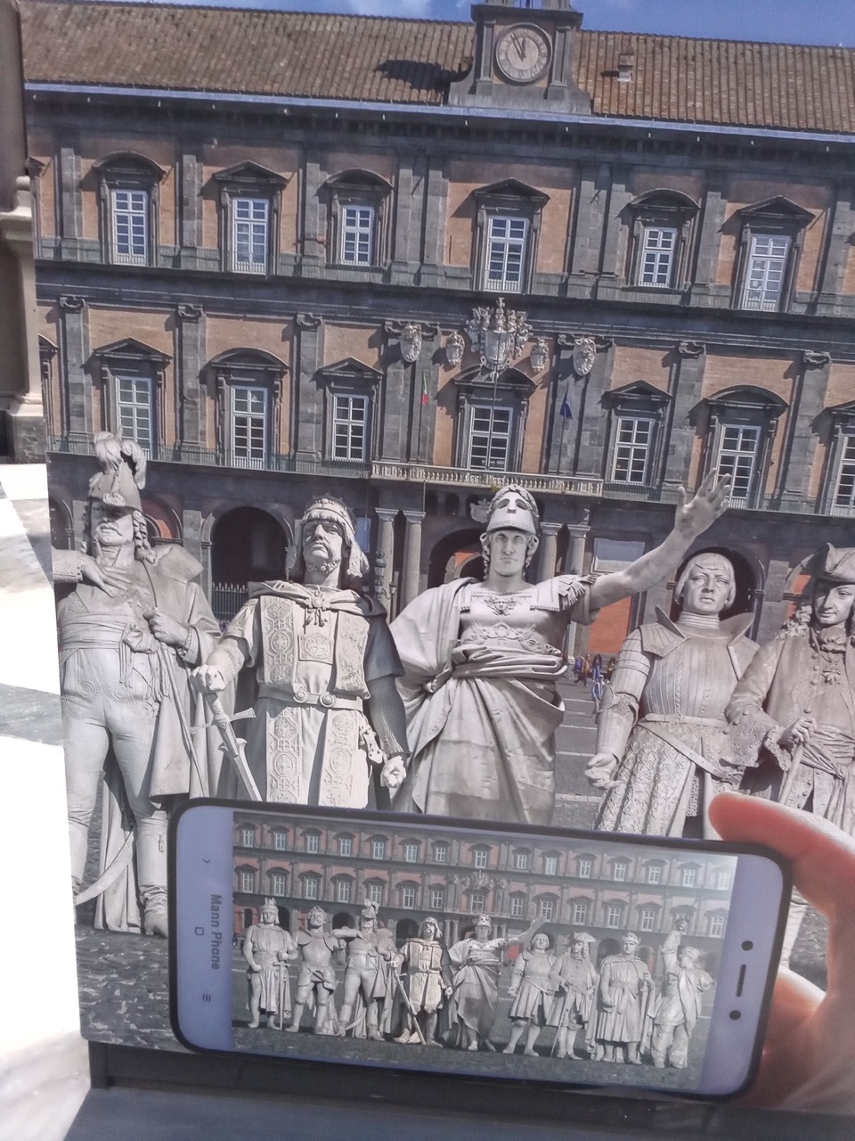 Una statua si fa un selfie a Castel dell’Ovo, un ‘altra va al mercato, un’altra si affaccia dal balcone in mezzo a una sbandierata di panni appesi, il guerriero passeggia tra i teschi del cimitero delle Fontanelle. Afrodite affiora dalle acque del porticciolo mentre Oceano è adagiato su una barchetta a remi di pescatori, all’ombra di un imponente Vesuvio. Non poteva mancare l’omaggio a Maradona e sullo sfondo della maglia numero 10 la figura mitologica di Atlante, schiacciata dal peso del mondo, se ne va in scooter. L’iconografico Ercole osserva se stesso su un podio immaginario all’ingresso del metrò.