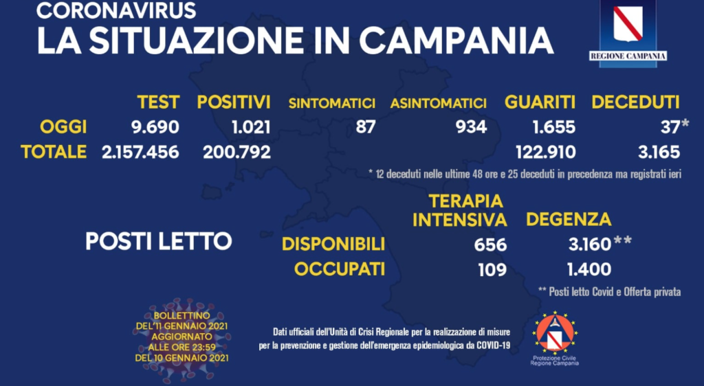 Sono 1.021 i nuovi casi di Covid 19 in Campania nelle ultime 24 ore, di cui 934 asintomatici e 87 sintomatici, su 9.690 tamponi. IL dato e’ dell’Unita’ di crisi della Regione e porta il totale positivi a 200.792, su un totale tamponi pari a 2.157.456.