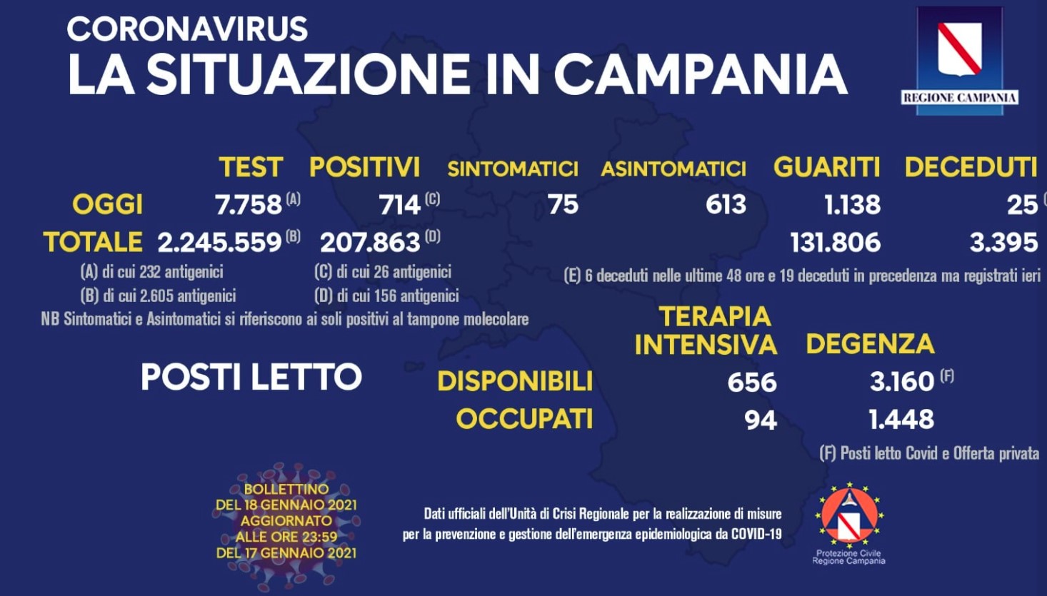 Sono 714 i nuovi casi di coronavirus emersi nelle ultime 24 ore in Campania, 75 dei quali sintomatici e 613 asintomatici. Sono stati analizzati 7.758 tamponi, 232 dei quali antigenici (26 di questi sono risultati positivi). Il totale dei positivi in Campania dall’inizio della pandemia è 207.863 (di cui 156 antigenici), mentre il totale dei tamponi processati è 2.245.559 (di cui 2.605 antigenici).