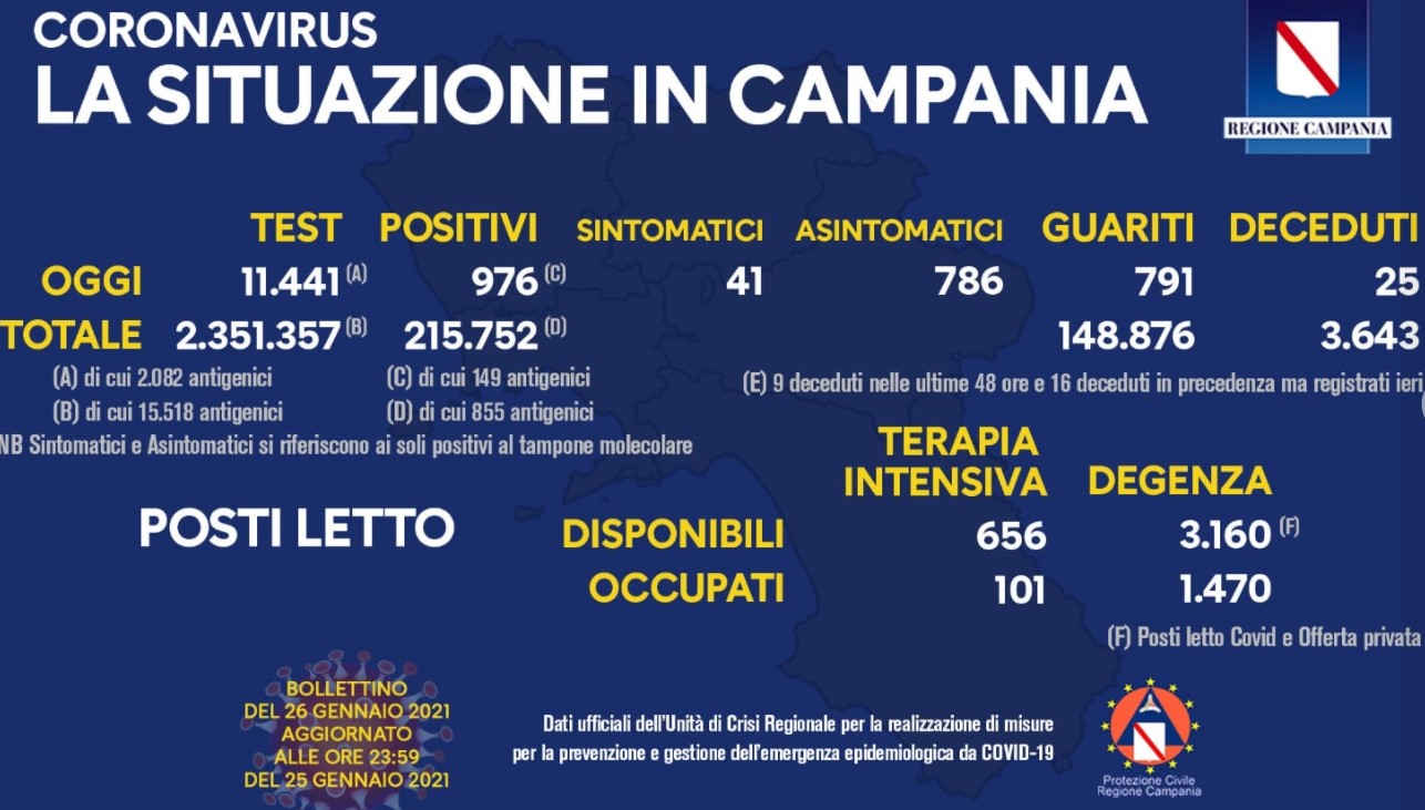 L’Unità di Crisi ha reso noto il bollettino sulla situazione Coronavirus di questo 26 gennaio. Nelle ultime 24 ore sono 976 i nuovi casi positivi, di cui 41 sintomatici. Il dato, come ogni lunedì, è leggermente inferiore a quello di domenica.