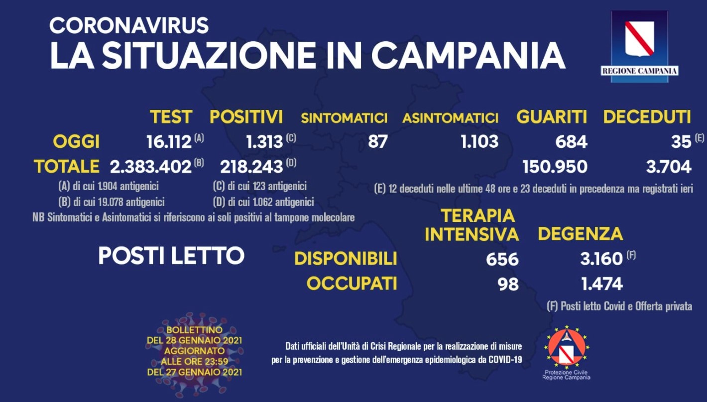 Sono 1.313, di cui 123 casi identificati da test antigenici rapidi, i nuovi casi di contagio registrati in Campania nelle ultime 24 ore, a fronte di 16.112 tamponi di cui 1.904 antigenici. Lo comunica l’Unità di crisi della Regione Campania, specificando che dei nuovi positivi 1.103 sono asintomatici, 87 i sintomatici. I guariti sono 684, le vittime sono 35 (12 deceduti nelle ultime 48 ore e 23 deceduti in precedenza ma registrati ieri). Sono 98 i posti letto di terapia intensiva occupati (656 il totale di quelli disponibili), 1.474 i posti di degenza (3.160 il totale di quelli disponibili).