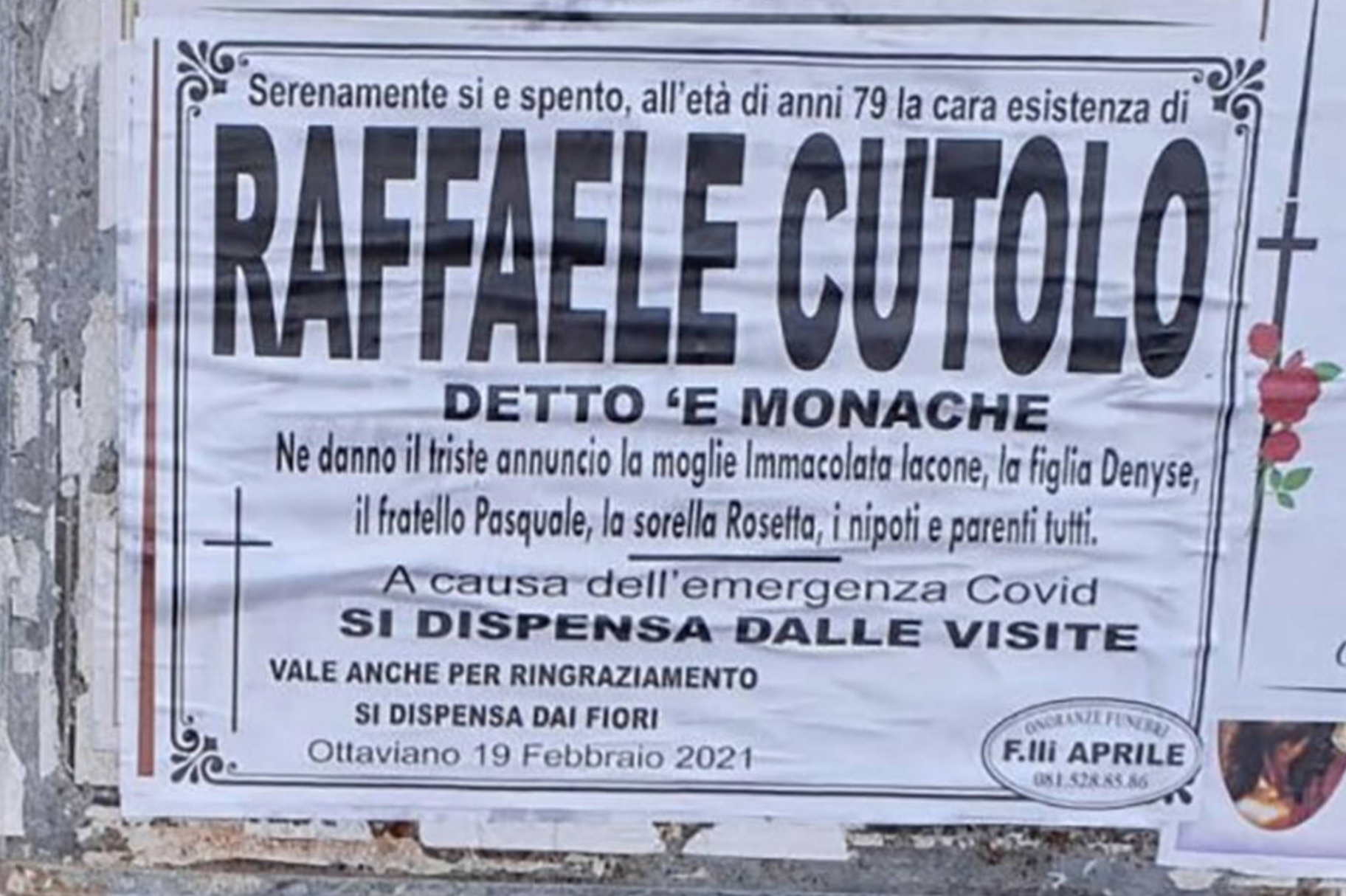 Sul manifesto si legge: “Serenamente si è spento, all’età di 79 anni, la cara esistenza di Raffaele Cutolo. Ne danno il triste annuncio la moglie Immacolata Iacone, la figlia Denyse, il fratello Pasquale, la sorella Rosetta, nipoti e parenti tutti. A causa dell’emergenza covid, si dispensa dalle visite”.