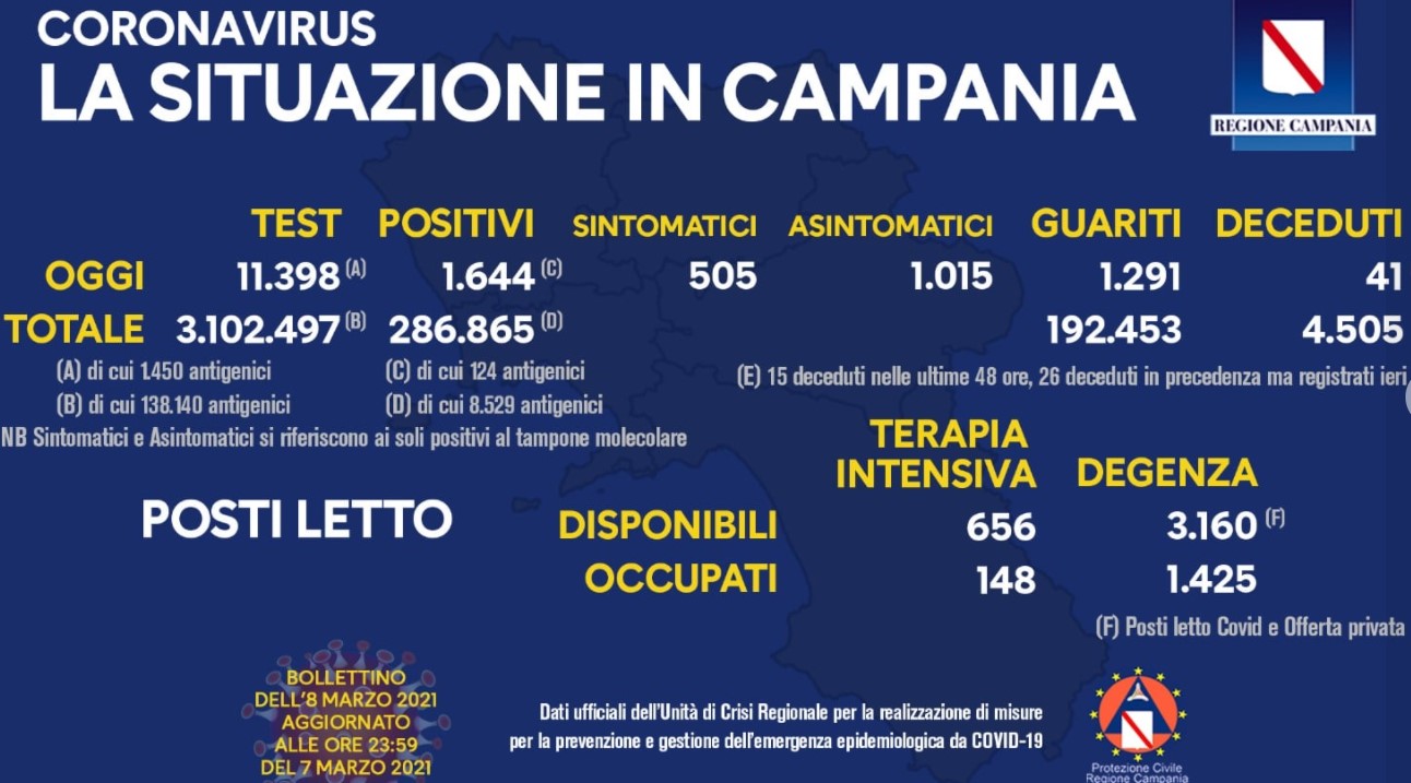L’Unità di Crisi della Regione Campania ha diramato il bollettino sulla situazione contagi da Coronavirus nelle ultime 24 ore. Il dato aggiornato di questo lunedì 8 marzo.