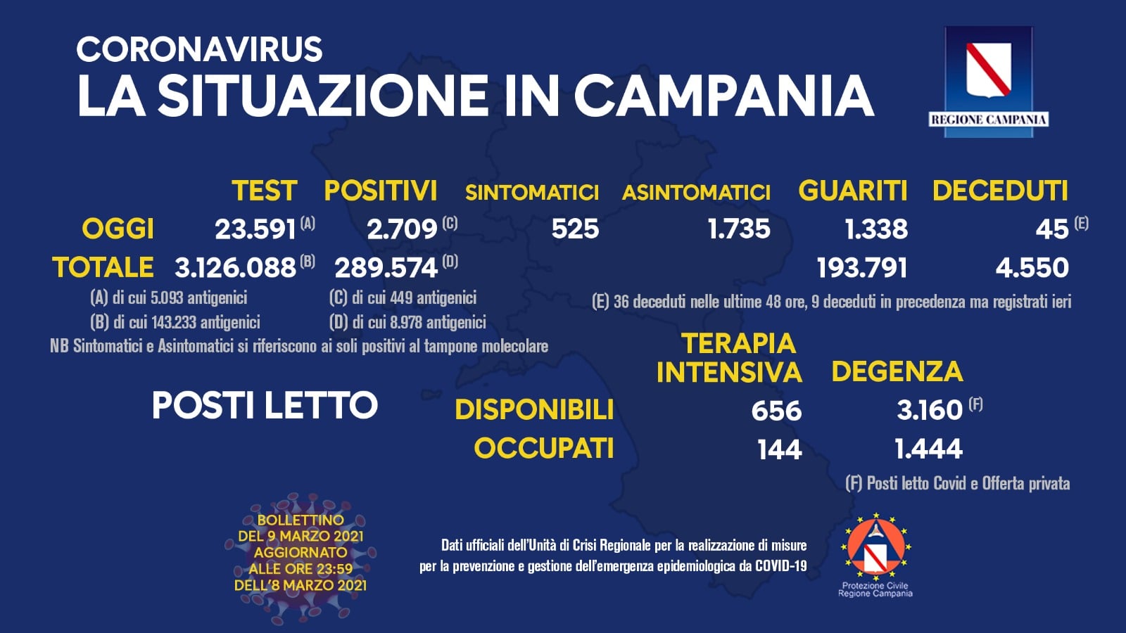 l totale dei positivi registrati dall’inizio dell’emergenza coronavirus in Campania è 289.574 (di cui 8.978 antigenici), i tamponi complessivamente analizzati sono 3.126.088 (di cui 143.233 antigenici). Nel bollettino odierno diffuso dall’Unità di crisi della Regione Campania sono inseriti 45 nuovi decessi, 36 avvenuti nelle ultime 48 ore e 9 avvenuti in precedenza, ma registrati ieri. Il totale dei decessi in Campania da inizio pandemia sale a 4.550. Sono 1.338 i nuovi guariti: il totale dei guariti è 193.791. In Campania sono 144 i pazienti Covid ricoverati in terapia intensiva, 1.444 i pazienti Covid ricoverati in reparti di degenza.