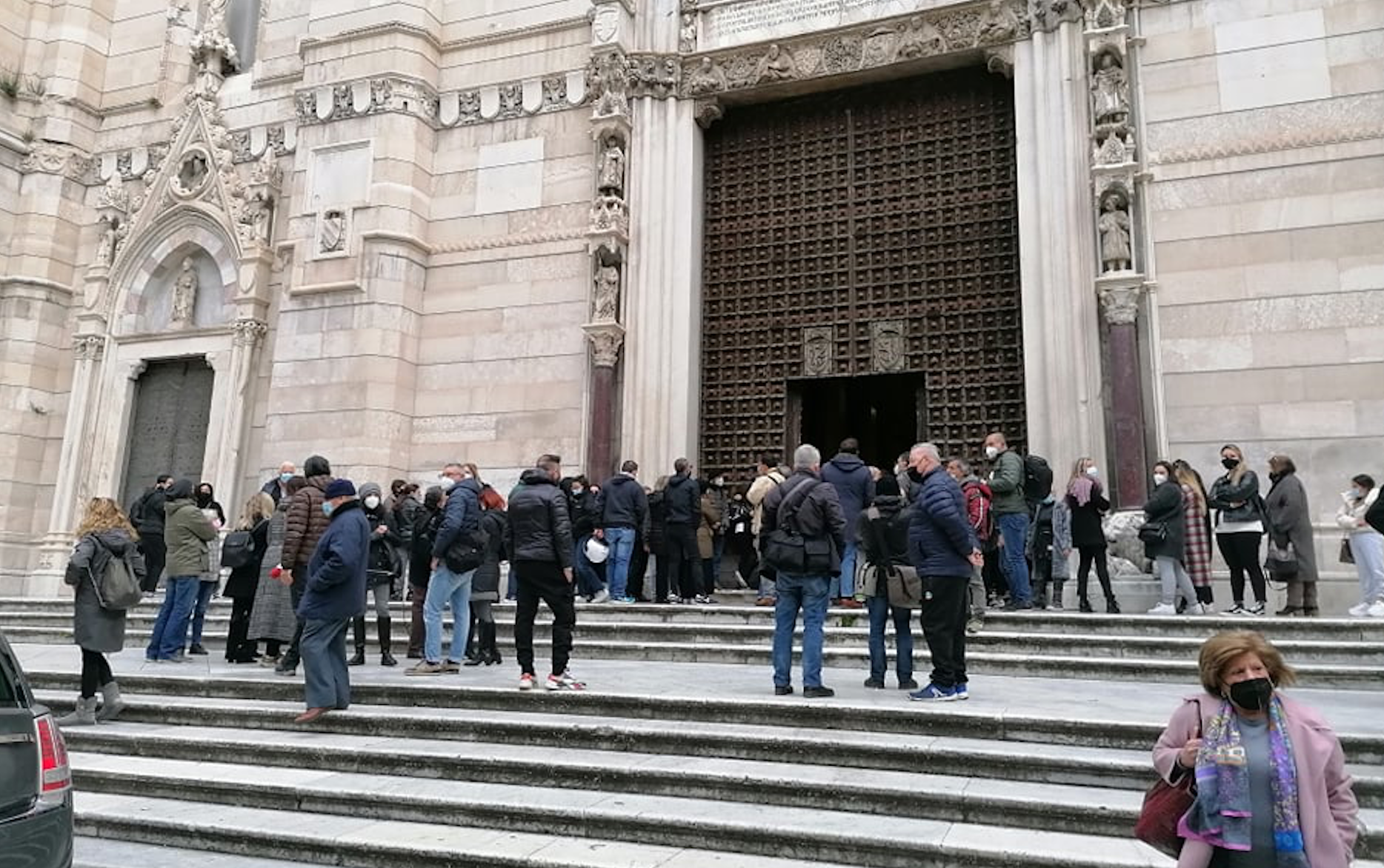 A qualche ora dalla cerimonia il Duomo risulta deserto, così come espressamente richiesto dalla famiglia alla vigilia, in rispetto delle norme anti Covid. All’ingresso, però, sono stati deposti poco dopo le 9 un cuscino e una corona di fiori bianchi. A mandarli è la famiglia Iacomino, suoceri e cognati di Ornella. Sono lì perché, per le norme anti-contagio, è stato precisato dal Duomo, non possono essere introdotti in chiesa. Prima dell’inizio delle esequie celebrate dal vescovo don Mimmo Battaglia la famiglia della donna ha espressamente chiesto di far accedere poche persone all’interno della cattedrale.