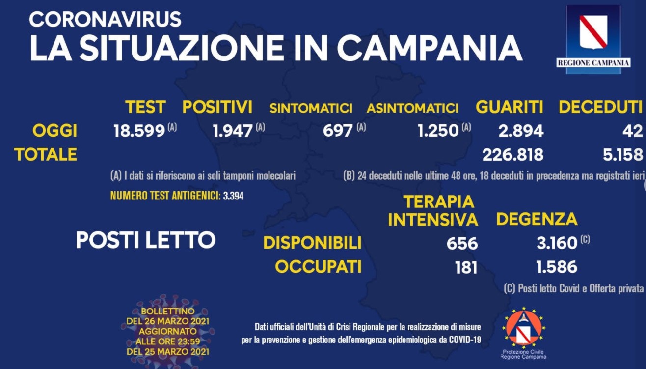 Sono 1.947 i positivi del giorno in Campania, riscontrati a fronte di 18.599 tamponi molecolari processati, pari al 10,5%. I nuovi sintomatici sono 697, il 36% dei positivi di oggi. Questi i dati trasmessi dall’unita’ di crisi regionale. I deceduti sono 42, di cui 24 nelle ultime 24 ore, mentre i guariti sono 2.894.