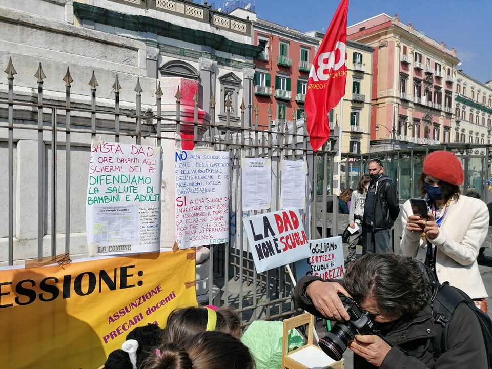 Sciopero nazionale della scuola e della Didattica a Distanza. Questa mattina anche a Napoli docenti e studenti sono scesi in piazza per aderire alla mobilitazione nazionale, che si sta svolgendo in 60 città Italiane. A gran voce genitori e insegnati chiedono la riapertura in presenza, in sicurezza e in continuità di tutti gli istituti scolastici, dal nido all’università.