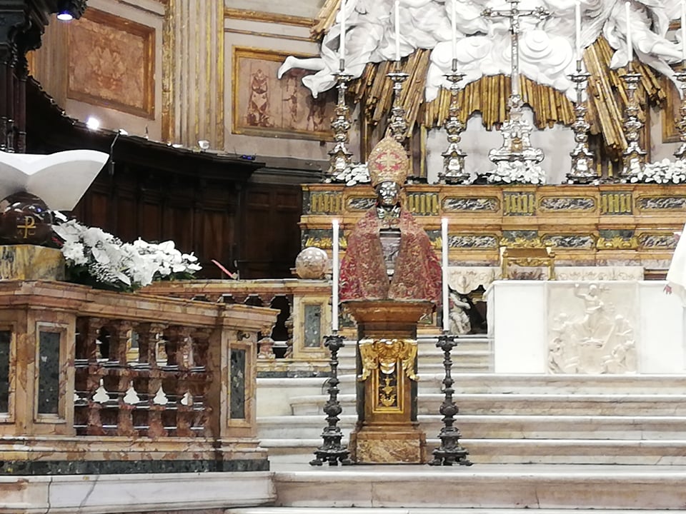 Nella prima celebrazione l’arcivescovo Battaglia, nella sua omelia ha detto: “Il sangue del Santo non è custodito solo in una teca ma nell’animo del popolo napoletano. Quest’anno non è possibile effettuare la processione che si snoda per le vie della città a causa dell’emergenza. Siamo in numero ridotto ma se le reliquie del Santo non possono andare tra le strade della città, sono le storie del popolo e dei vicoli che entrano in Cattedrale”.