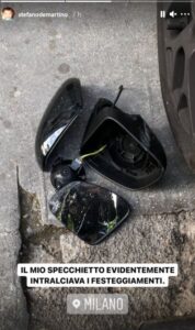 L’atto vandalico è avvenuto nella giornata di domenica, probabilmente durante i festeggiamenti per lo scudetto vinto dall’Inter. Il ballerino napoletano ha scritto: “Il mio specchietto evidentemente intralciava i festeggiamenti”. Poi ha aggiunto il tag al luogo in cui si trovava, dunque Milano. Secondo De Martino lo specchietto gli sarà stato rotto proprio durante la festa che si è tenuta in strada.