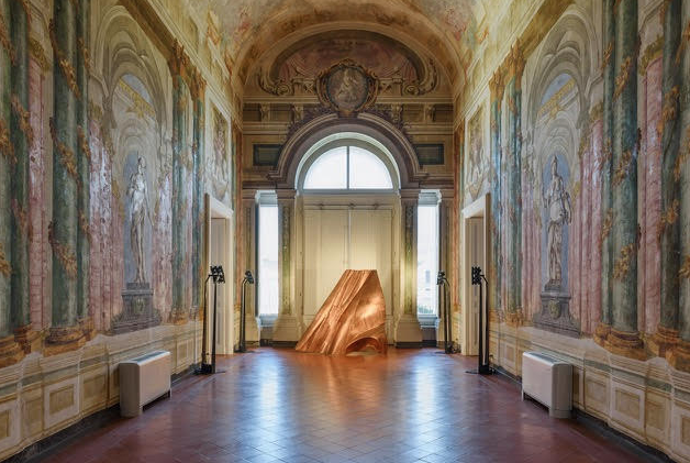Si apre con We the people di Dahn Vo (uno dei 250 elementi in cui l’artista ha scomposto la statua della Libertà), che dialoga con le statue di Minerva e Mercurio raffigurate negli affreschi barocchi della sala. Si prosegue con il “Tree Jesus”, un Gesù “ingabbiato”, realizzato dall’arcinoto duo artistico Gilbert and George. C’è l’opera evocativa di Kounellis, cappotto strappato con coltello infilzato, c’è la donna accovacciata di Ryan Mendoza intitolata Don’t Worry, she likes it. L’artista tedesco Daniel Knorr interpreta La Giustizia come una statua di gesso con testa incappucciata a mo’ di terrorista. Molto arcimboldesco l’opera, “ In Rainbows” dell’artista Trey Abdella.