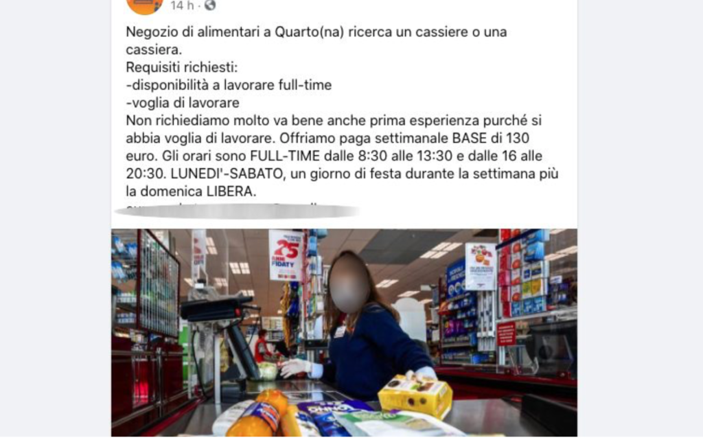 “Negozio di alimentari a Quarto ricerca un cassiere o una cassiera. Requisiti richiesti: disponibilità a lavorare full-time, voglia di lavorare. Non richiediamo molto va bene anche prima esperienza purché si abbia voglia di lavorare. Offriamo paga settimanale base di 130 euro. Gli orari sono full time dalle ore 8.30 alle 13.30 e dalle ore 16 alle 20.30 dal lunedì al sabato, con un giorno di festa durante la settimana più la domenica.”