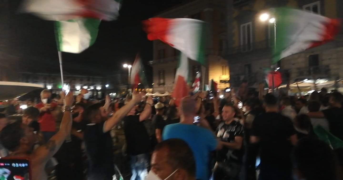 Anche a Napoli, come in tutto il Paese, è scoppiata la festa. In strada caroselli di scooter e folla in delirio. Piazza Trieste e Trento si e colorata di bianco, rosso e verde come la bandiera italiana.