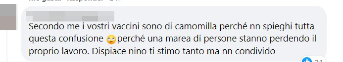 Un’altra persona si è detta molto dispiaciuta per la scelta di Nino D’Angelo: “Secondo me i vostri vaccini sono di camomilla perché non si spiega tutta questa confusione. Perché una marea di persone stanno perdendo il proprio lavoro. Dispiace Nino ti stimo ma non condivido“. Come questo ci sono tanti altri messaggi del genere cui il cantante napoletano ha preferito non rispondere.