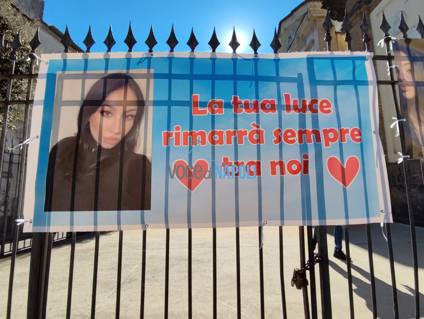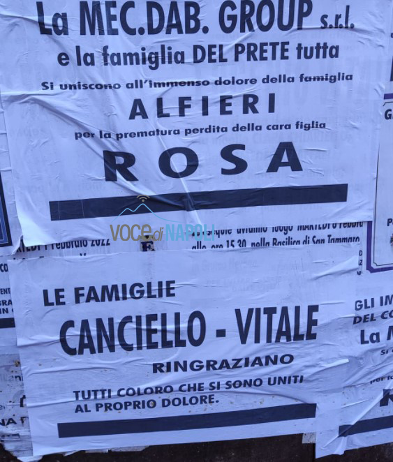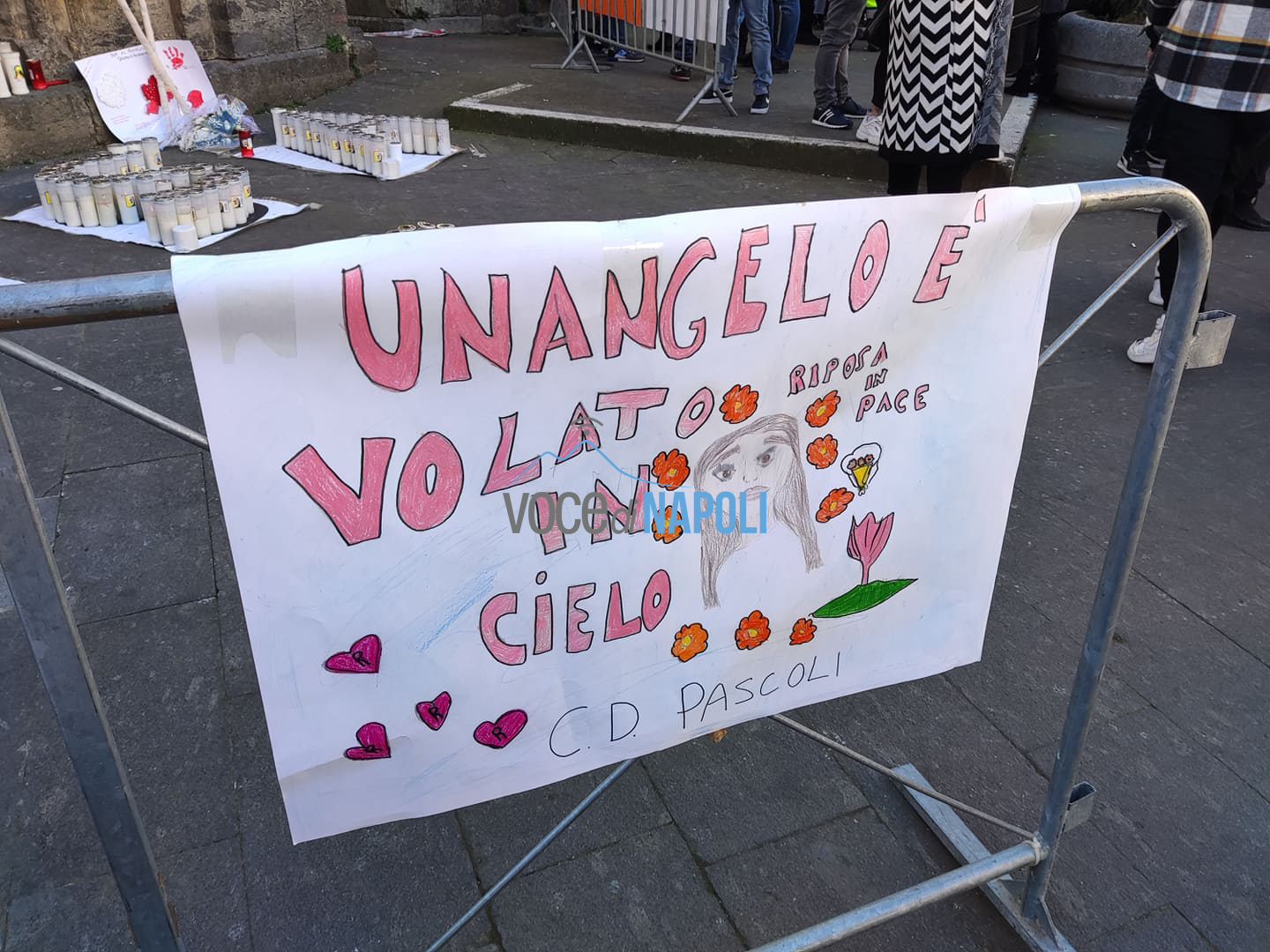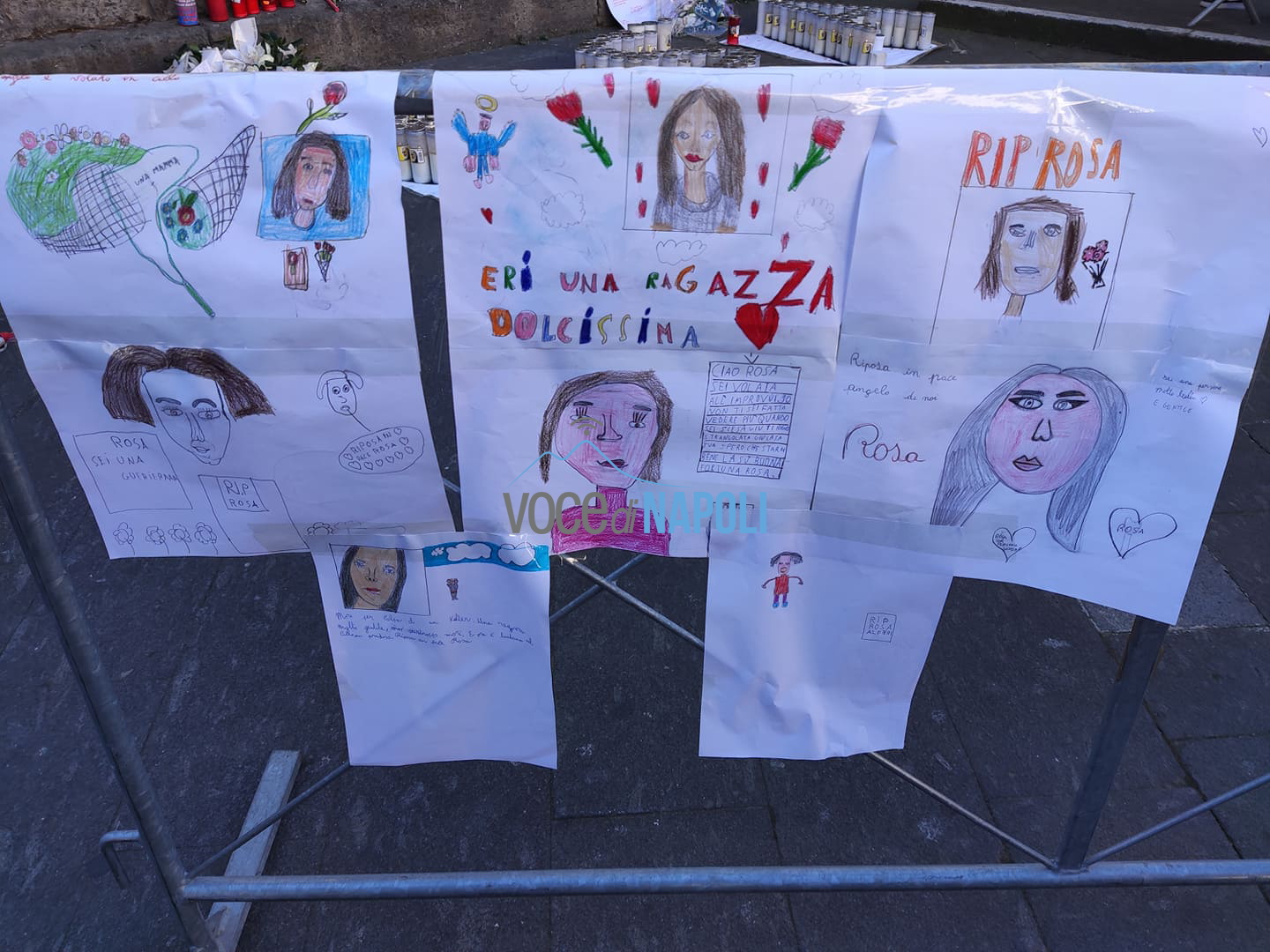 Davanti alla chiesa tanti striscioni con la scritta del nome di Rosa, una composizione di candele che ricompongono il nome della giovane e ancora fogli e disegni fatti dagli alunni delle scuole, che assieme a tutta la comunità si domandano: “Perché?”.