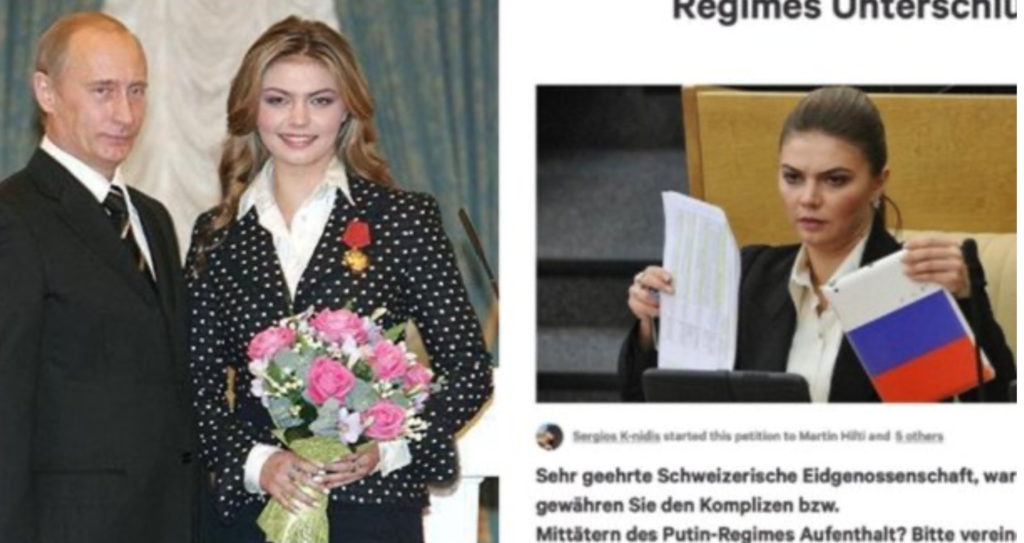“Nonostante la guerra in corso, la Svizzera continua ad ospitare un complice del regime di Putin. Noi cittadini di Russia, Bielorussia e Ucraina, che attualmente sta attraversando un’immensa sofferenza, ci uniamo per fare appello alle autorità svizzere», continua il messaggio. L’opinione pubblica ha appena appreso che la figura politica e mediatica russa, ed ex atleta, Alina Kabaeva, si sta nascondendo in conseguenza delle sanzioni imposte alla Federazione Russa nel TUO paese. È la moglie preferita del delirante dittatore e criminale di guerra che ha attaccato a tradimento l’Ucraina nelle ultime settimane. Allora perché ora, visto il volume delle sanzioni imposte alla Russia, continui ad ospitare lei e la sua famiglia, mentre Putin sta distruggendo la vita di milioni di persone? È ora di riunire Eva Braun con il suo Führer!“. Una petizione scritta in inglese, tedesco e francese, che sta avendo molte adesioni”.
