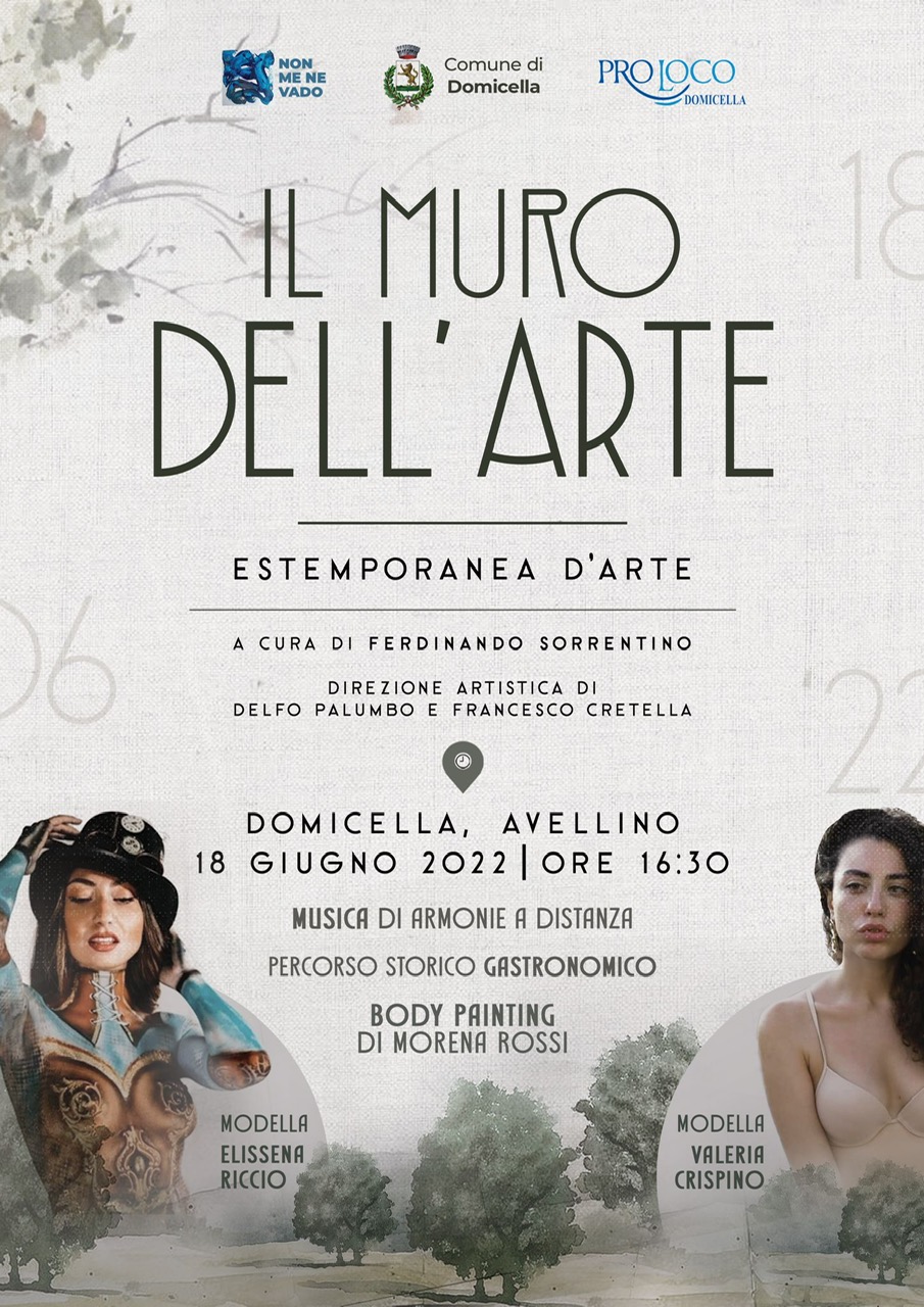 Si terrà sabato 18 giugno, a partire dalle 16.30 e fino sera inoltrata, l’evento “Il muro dell’arte”, curato da Ferdinando Sorrentino e con la direzione artistica di Delfo Palumbo e Francesco Cretella. L’appuntamento è a Domicella (in provincia di Avellino), in via Raffaele Ferrante, dove saranno presentati e inaugurati dieci panelli di dimensione 70×100 centimetri fatti realizzare per l’occasione dal Comune di Domicella per numerosi artisti che daranno vita in maniera estemporanea a opere uniche. L’evento è stato fortemente voluto dall’amministrazione comunale diretta dal sindaco Antonio Corbisiero.