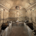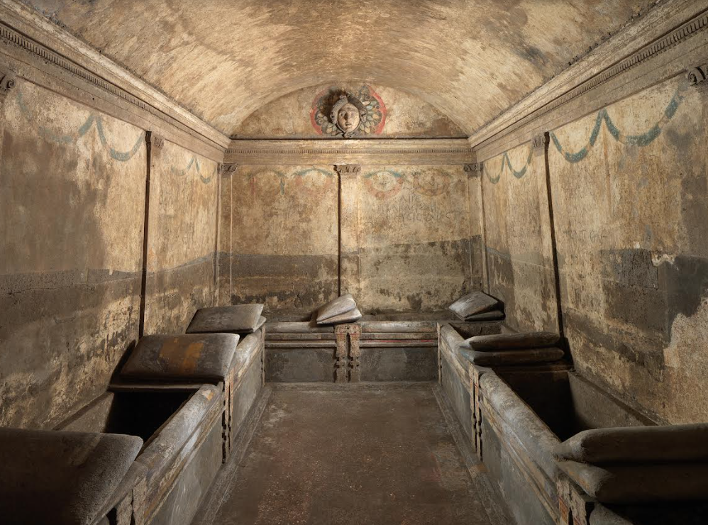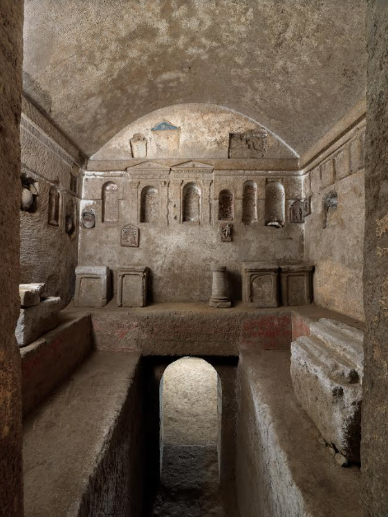 Oggi si accede al sito scendendo tramite una scala a 11 metri sotto il livello stradale per immergersi in un mondo “sotterraneo” ancora vivo, ricco di decori e stucchi, 700 pezzi, colori vivaci e raffinatissimi effetti di trompe l’oeil. E’ già diventata icona la ragazza con il rossetto, la miss dell’ipogeo, un’influencer ante litteram, intatta nella sua modernità.