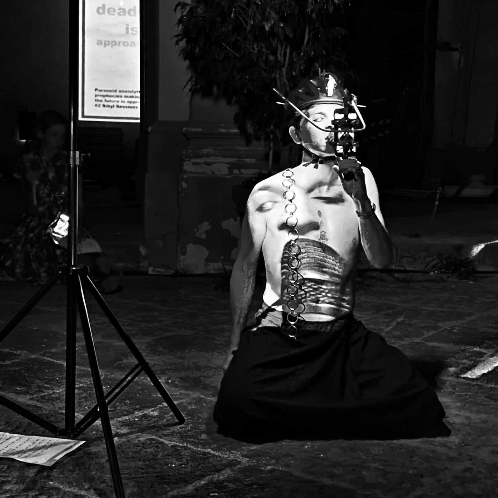 “Devo a lui la conoscenza del Grande Cinema internazionale d’autore negli anni ’80”, ricorda Maurizio Gemma, responsabile della Fondazione Film Commission della Regione Campania, seduto in prima fila per un full immersion nella coinvolgente performance multimediale di Alessia. Spettacolo mutante, dove si improvvisa molto, con finale aperto che si avvale dell’intrusione in scena della girandola di social, video art, body art e sound designer ( ma com’era sexy quella voce) che reinterpreta “Deus ecce Deus” partendo dal testo in latino dell’Eneide e dall’incontro criptico tra Enea e la Sibilla. L’attore performante un faraone dei nostri giorni ( al posto della corona un casco tecnologico, genialissimo e multifunzionale inventato dall’artista Benjamin Sillon) chiede ossessivamente all’oracolo: “Sono o non sono posseduto dalla mia immagine”. E’ Alessia, l’alterego di una Sibilla virtuale, a rispondere: “Lo siamo tutti…”.