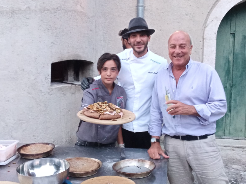 Ultimo giro, amoreggio top del top il Fiano di Avellino, Docg Riserva Erminia 2000. E’ l’anno del Millennio, è dedicato alla memoria della adiratissima sorella, è stata il motore dell’azienda che è diventata un’eccellenza made in Sud. Un vino complesso, vulcanico, performance ( proprio come deve essere un amante)-mi dicono- che in 22 anni ha mantenuto la sua capacità evolutiva senza stonature. Un nettare così pregiato, una volta in bocca non lo sputo mica – come si farebbe alle degustazioni . A questo punto entra in campo il “pairing”, abbinamento con piatti strutturati, importanti. Il menù spazia dalla pizza /focaccia sfornata dal master pizzaiolo Salvatore Lioniello aiutato dal figlio dodicenne. Il più giovane pizzaiolo d’Italia, le famose frittate al limone di Mirco Balzano, formaggi Barlotto da Paestum e le delizie della patisserie Pansa d’Amalfi. Tutte eccellenze made in sud.