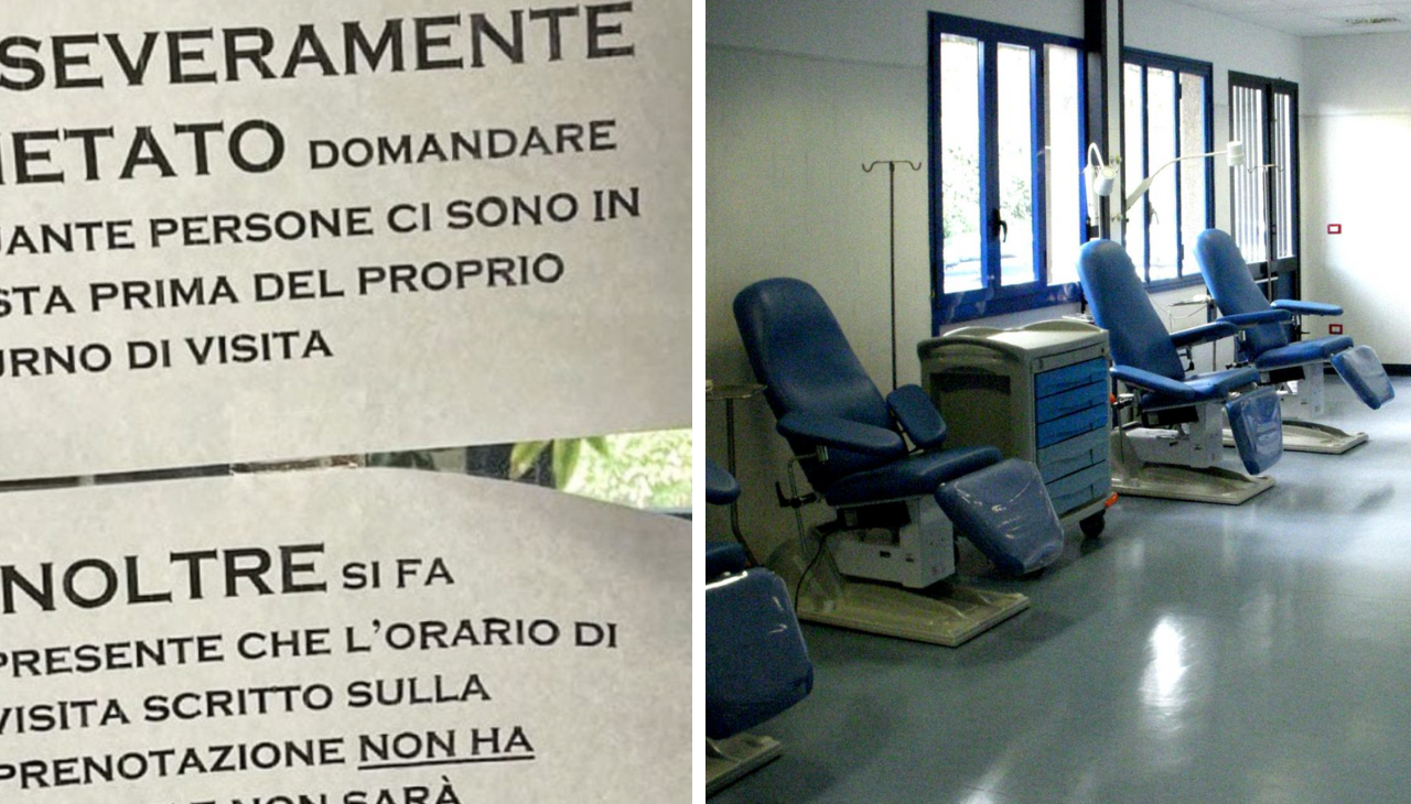 Come racconta l’edizione Napoli di Repubblica: “Sul bancone vetrato della sala d’attesa di una struttura clinica di Oncologia del Nuovo Policlinico. Università Federico II” ci sono due cartelli della vergogna. Sopra c’è scritto: “Si comunica ai pazienti che è severamente vietato domandare quante persone ci sono in lista prima del proprio turno”, un monito a non scocciare, a non chiedere quanto bisognerà attendere per avere le cure.