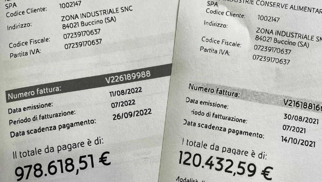 Ci troviamo in provincia di Salerno e Francesco Francese, CEO de La Fiammante, ha pubblicato sul profilo social due bollette relative a luglio 2021 e luglio 2022: la prima di 120mila euro, la seconda quasi di 1 milione!