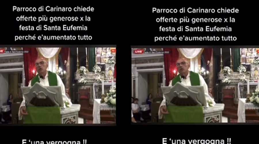 Polemiche ha infatti scatenato il video che riprende il parroco della chiesa di Sant’Eufemia a Carinaro chiedere offerte più generose ai fedeli per la festa a causa degli aumenti. Don Antonio Lucariello dal pulpito avrebbe detto: “Quest’anno qualche cosa in più, perché ovunque siamo andati ad acquistare e fare i contratti, ci hanno detto che tutto è aumentato. Basta un poco in più. Voi già avete capito. Dio ama chi dona con gioia, chi dona con tutto il cuore. Non con le lacrime, non con tristezza. Come gli sposi: con le lacrime di gioia”. Tantissime le polemiche sui social..