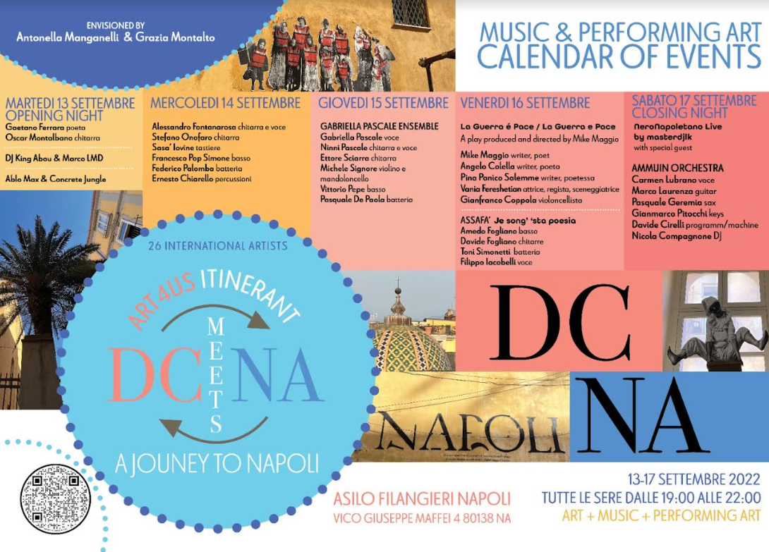 Il DC meets Napoli è ideato e curato da Antonella Manganelli e Grazia Montalto, in seguito alla mostra: DC Unsettled – da loro curata e presentata a Washington DC nel marzo 2022. Antonella e Grazia, hanno colto le similitudini di Washington DC, citta’ di di residenza, e Napoli, citta’ di infanzia e giovinezza, scoprendone I punti comuni legati alla loro instabilità la continua oscillazione tra forze negative e positive, e la capacita di entrambe le città di generare energia per adattarsi e cambiare, rigenerando la vita con nuove visioni. Hanno visto quindi le due città parallele e le hanno scelte per il loro discorso artistico organizzando la prima mostra itinerante di ART4US “DC incontra Napoli: Diario di un Viaggio Artistico.
